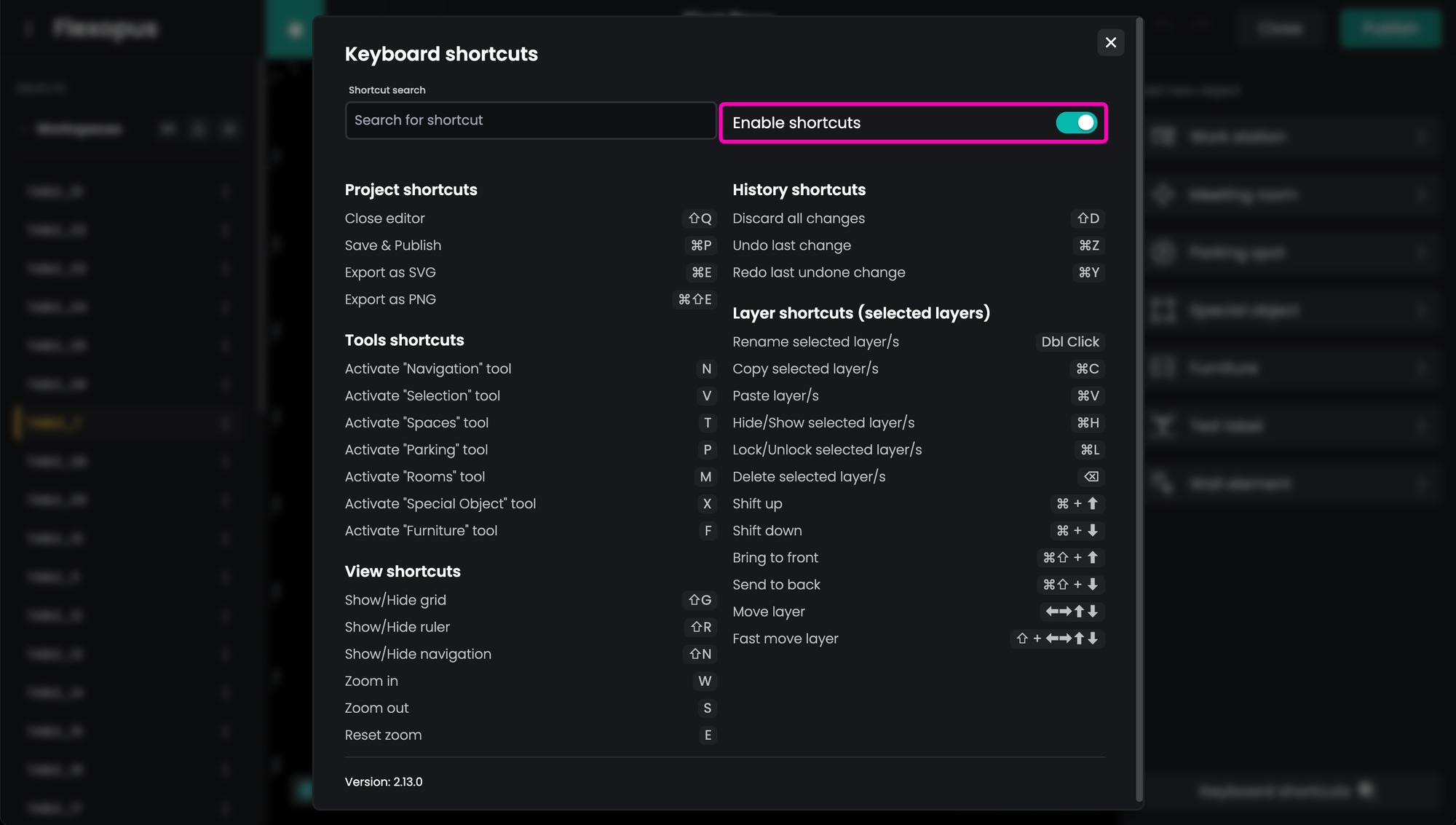 By default, shortcuts are turned on. This may cause issues since binding the key combinations to Floorplanner might prevent the system or other apps from handling important keyboard shortcuts. If you experience any blocking issues, you can disable Floorplanner's shortcut handling in the dialog.