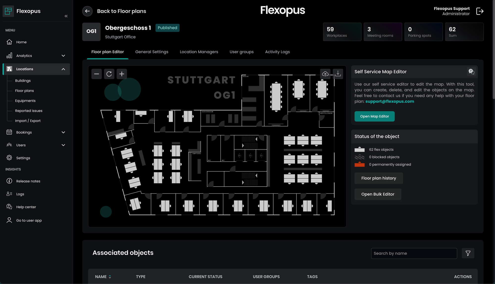 If you navigate to Dashboard > Locations > Floor plans and open a floor, you can view the floor plan, which is one of the most important entities in the application. Resources such as workstations, meeting rooms, and parking spots can be placed on the floor plan for better management and organization.
