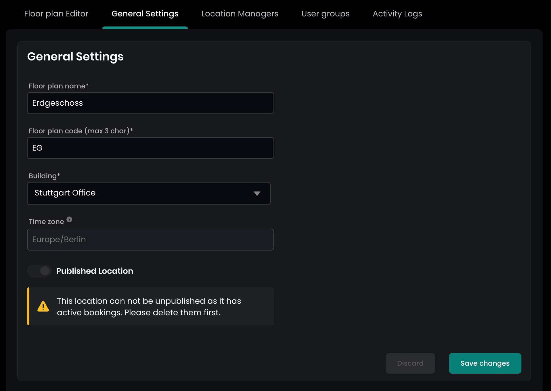 This hides the floor from users. To do this, open the floor and navigate to the General Settings tab. You can only unpublish the floor if none of the associated resources have upcoming reservations. Therefore, make sure to delete any upcoming reservations first. - Delete the floor