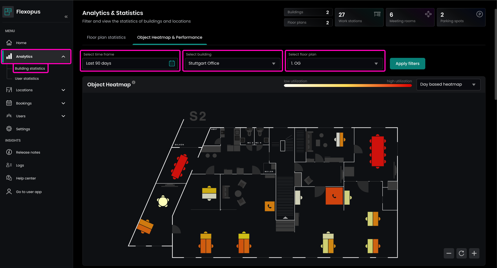 The resource heatmap and utilization statistics are generated without using personal data, much like the building statistics. These calculations are based on anonymized reservations, focusing solely on which resource was booked and when. Since user-specific information isn't required for these calculations, the data can be stored indefinitely under GDPR guidelines.