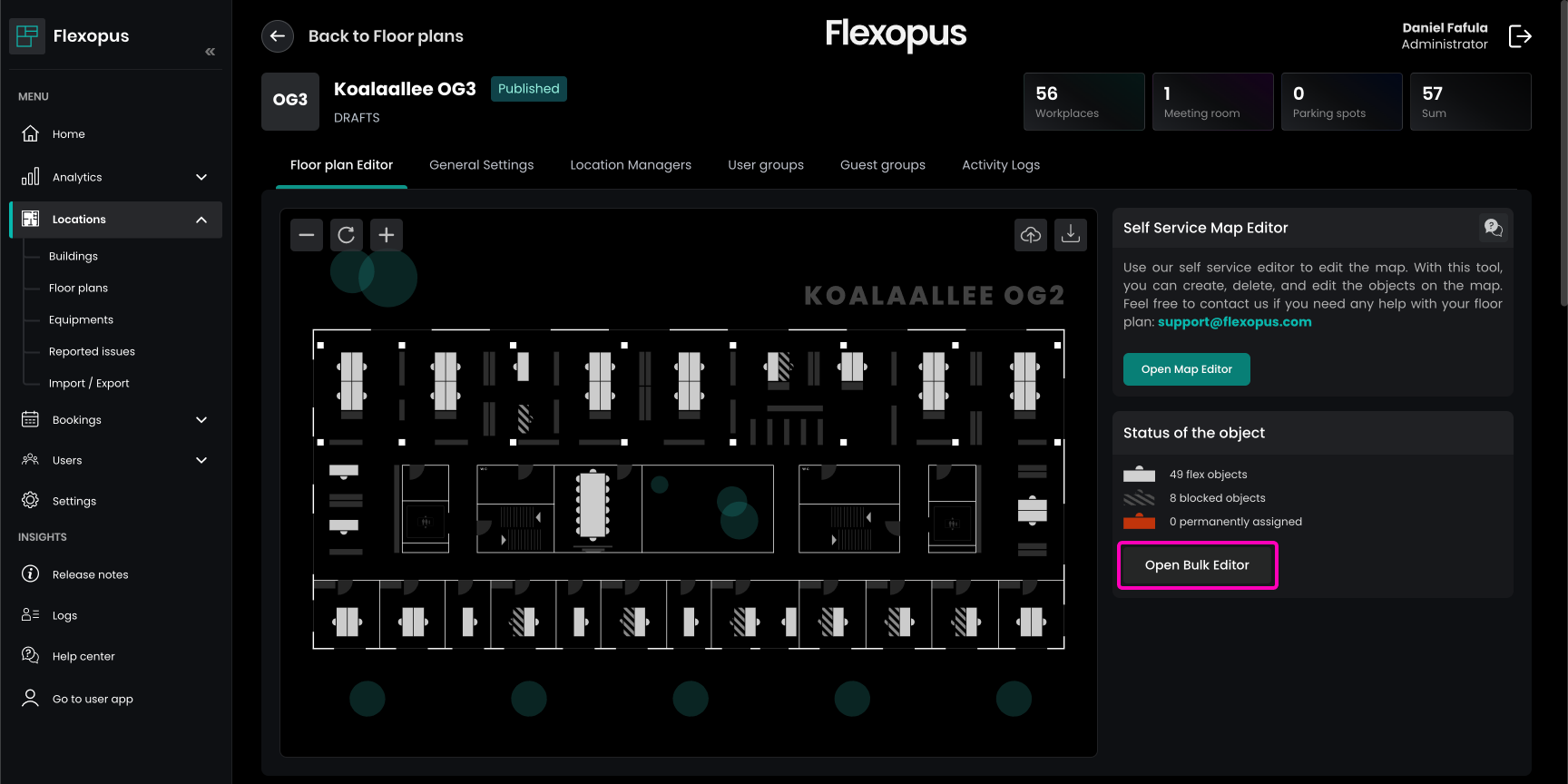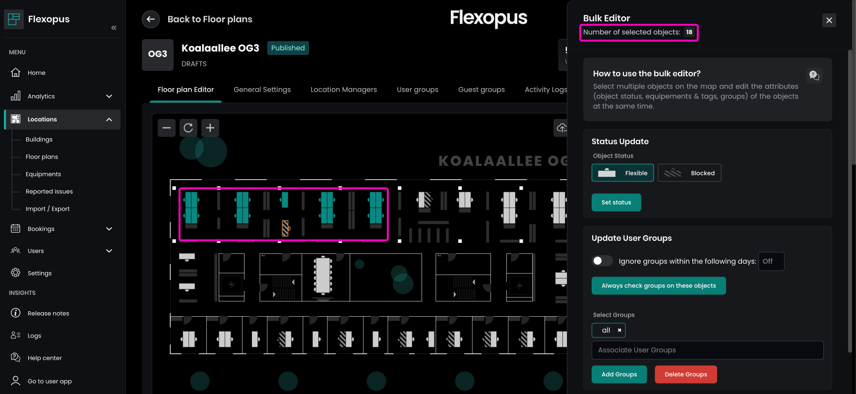 Often, it's necessary to apply the same attributes to multiple resources, such as workstations in a hybrid work environment, where the setup is typically consistent. Editing resources one by one can be time-consuming. To streamline this process, you can use the Bulk Editor found in the Floor Settings to apply changes to multiple resources at once.