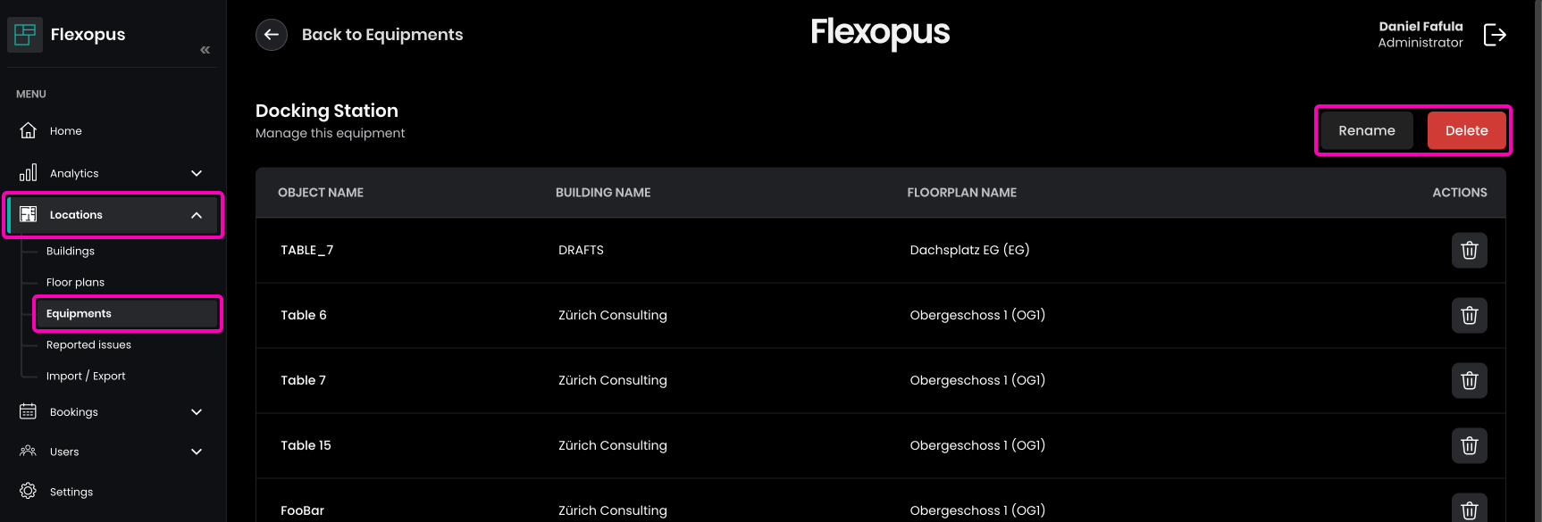 Over time, it can be easy to lose track of which equipment and tags are connected to your resources. For a better overview, navigate to Dashboard > Locations > Equipments. There, you can see all the equipment and tags created in the system. By opening equipment, you can view which resources are currently associated with it, and you can also rename already associated equipment if needed.