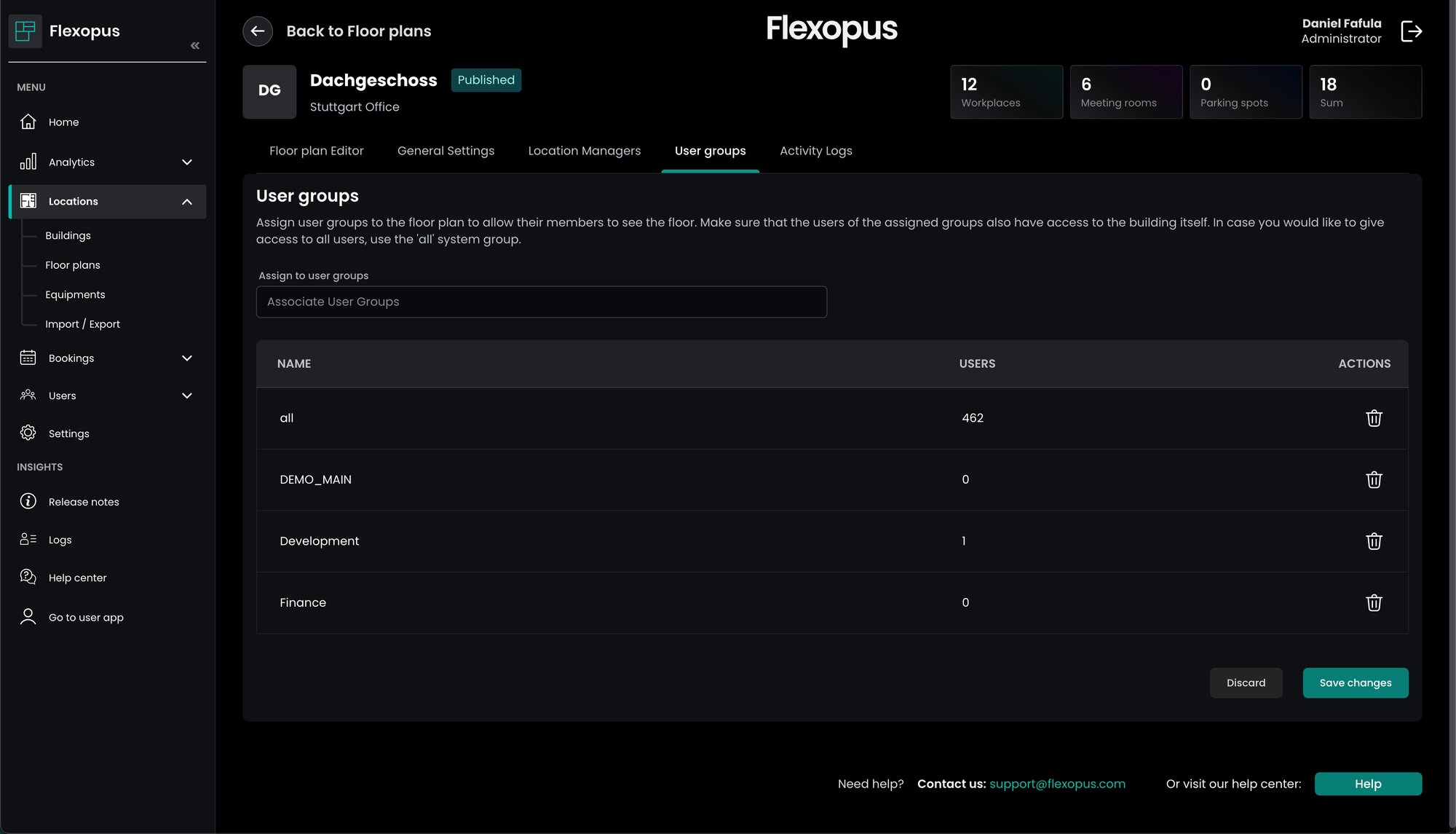 As an administrator, you can view and manage all floor plans in the admin dashboard. By default, the group “all” is assigned to all floor plans, giving everyone access initially. To change this default group assignment, go to Dashboard > Locations > Floor plans. There you select the floorplan you want to manage the user groups for by clicking on the pencil icon. From there you can navigate to User groups.