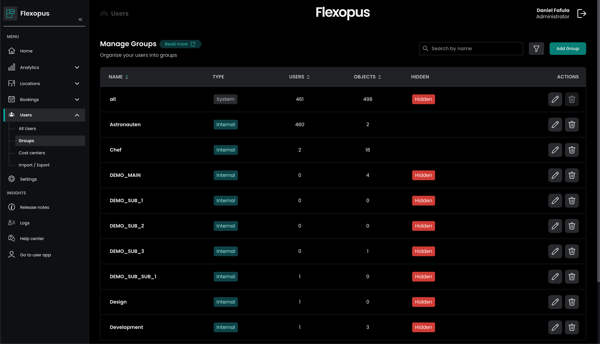 2. internal: The internal groups are created by an administrator manually, or it's an external group which was moved to become an internal group. Internal groups can be edited and deleted within Flexopus.