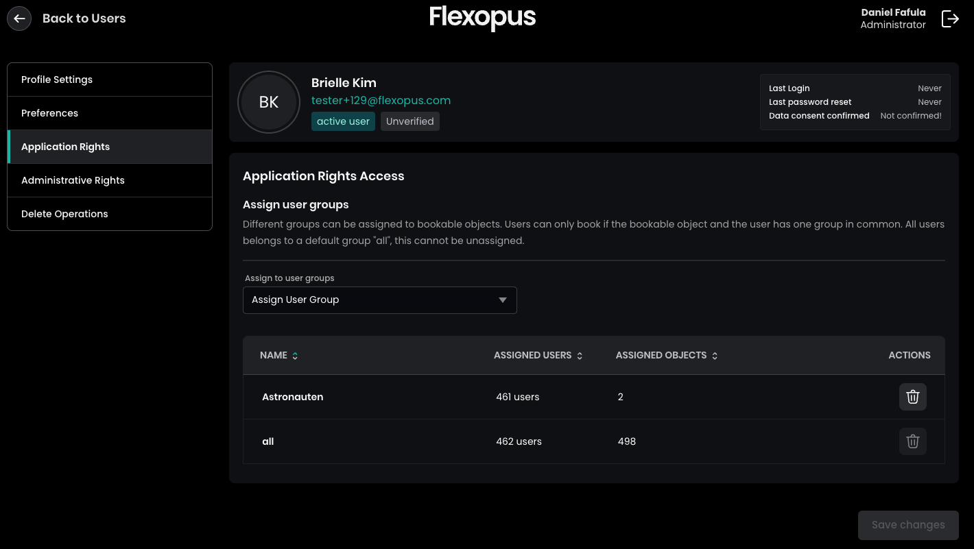 You can also see the user groups for each user individually in their user profiles. Select a user and navigate to the Application Rights menu item. Here you can view and manage the linked groups of users.