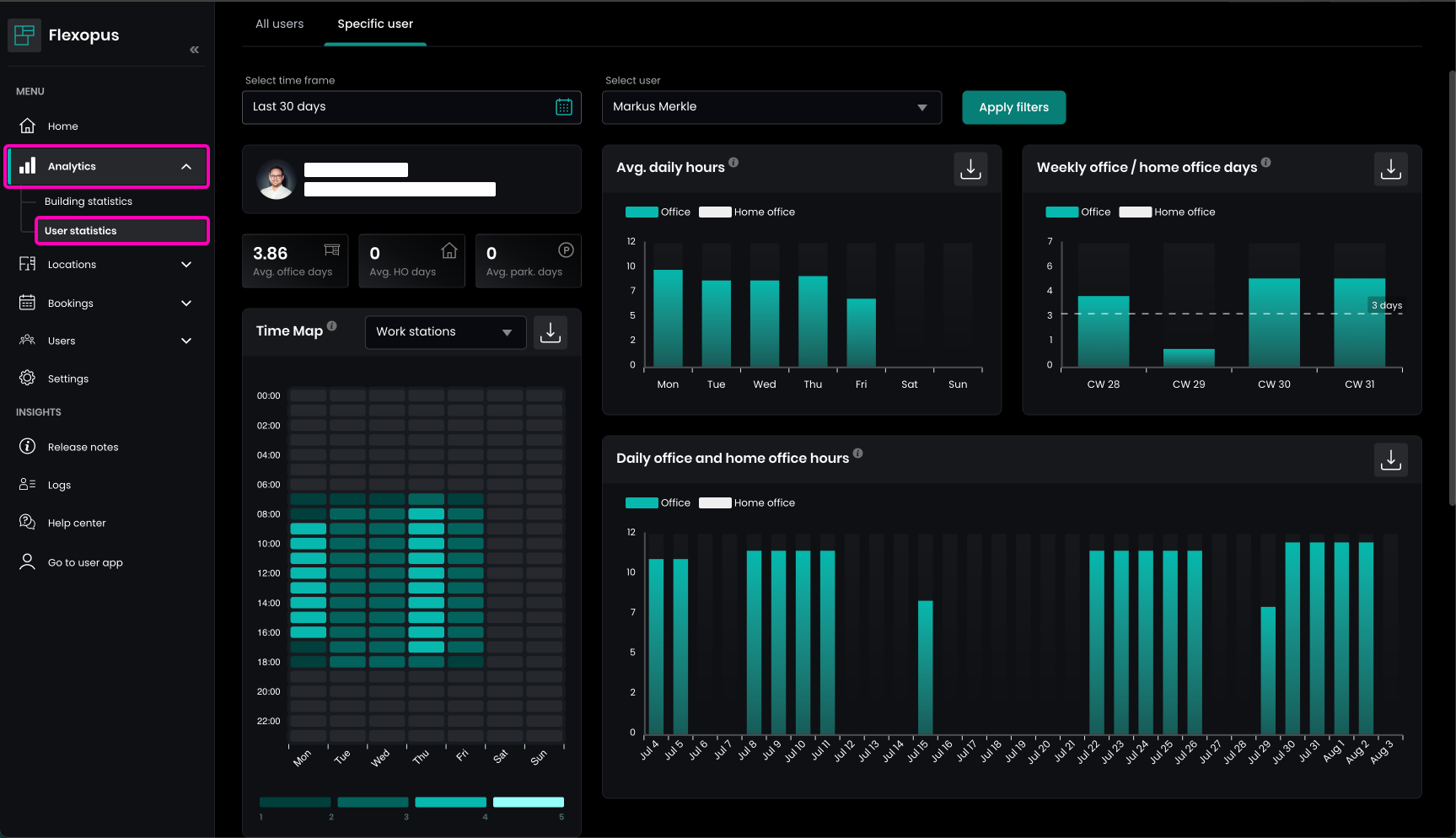 The first KPIs show the average number of bookings per week for office, home office, and parking spots made by the user within the selected time frame: