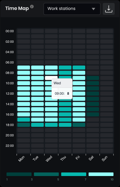 This statistic shows the average number of hours booked per day during the week. It's calculated by taking the sum of workstation or home office reservations in hours for each day of the week, divided by the number of days in the selected time frame.