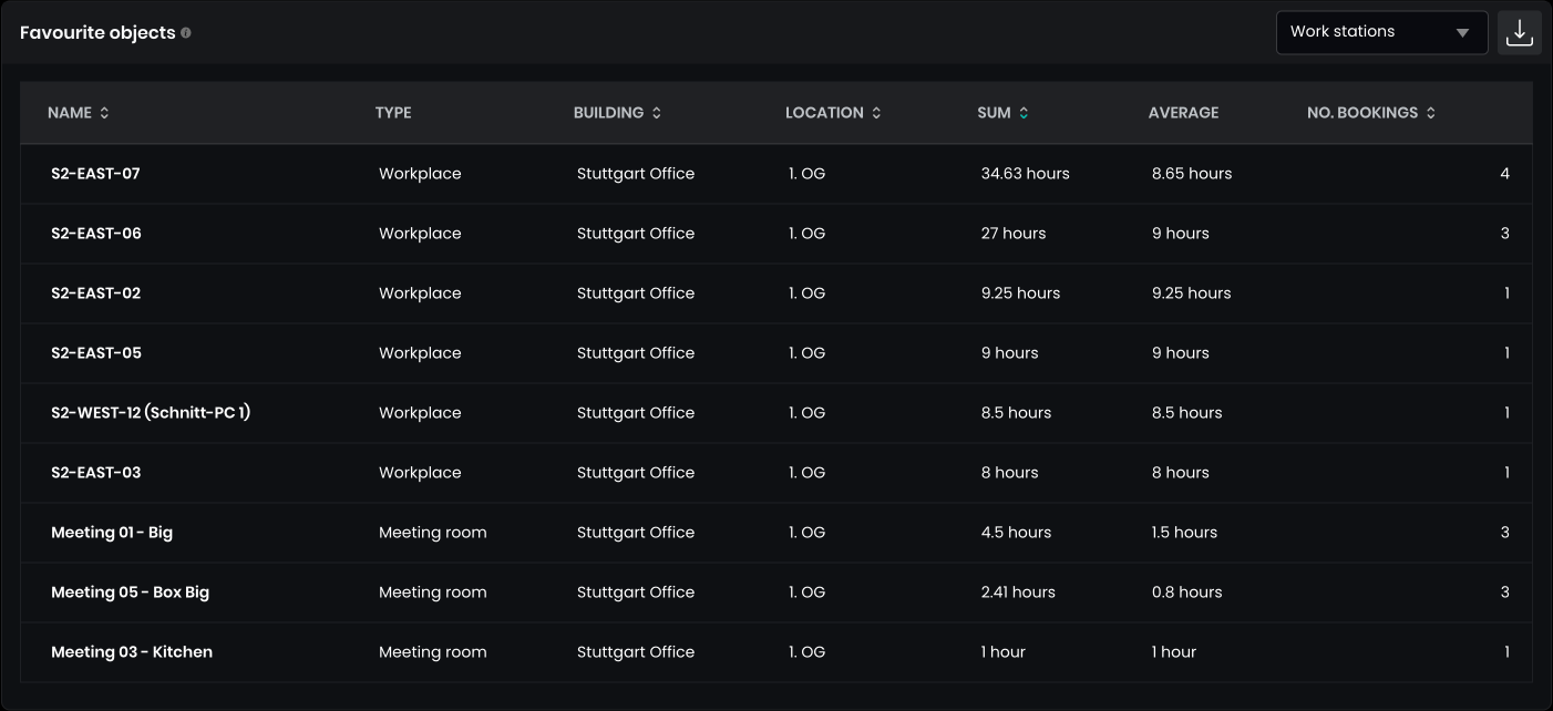- Avg. office days: The sum of days with at least one workstation reservation, divided by the number of weeks in the selected time frame.