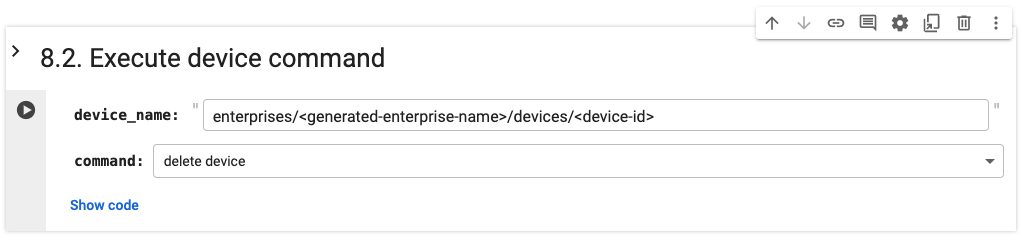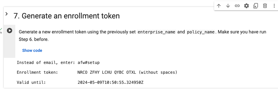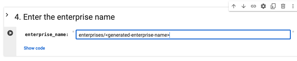 The notebook will print your enterprise name. Enter this name in the next cell's input field: enterprises/<generated-enterprise-name>