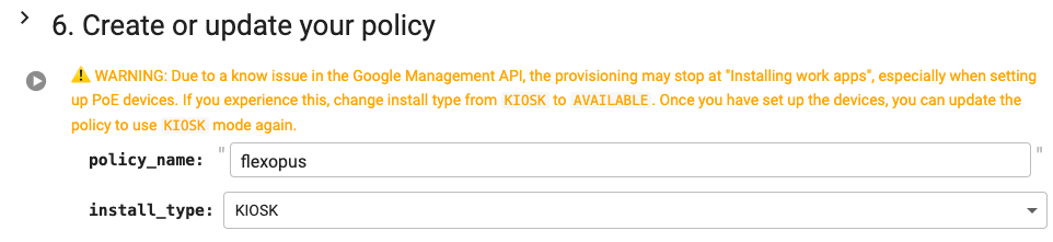 The policy_name uniquely identifies the policy, so every time you want to make changes to it, you will have to provide the exact name. Here we only enter the name flexopus, but it will be prefixed to enterprises/<generated-enterprise-name>/policies/flexopus.