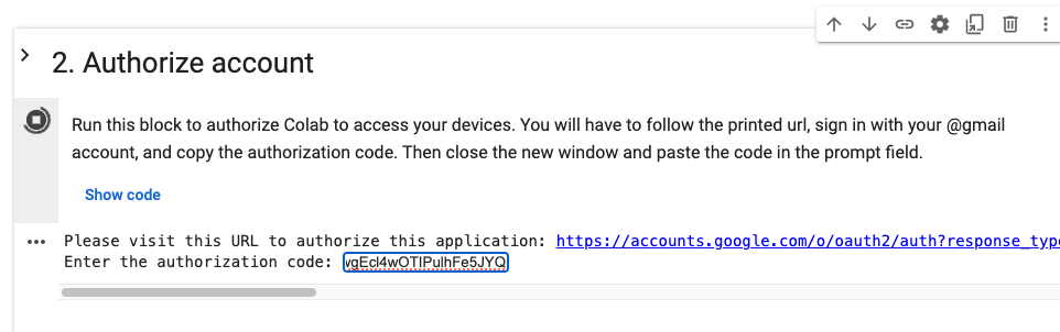 Run the second code part to authorize Google Colab to manage the devices. It will ask you to click the blue printed link and sign in with your Google account via OAuth2. After the login, you will see an authorization code. Copy the authorization code provided by the other page, and paste it into the input field in the notebook. Hit Enter, and you will see a message Authentication succeeded.