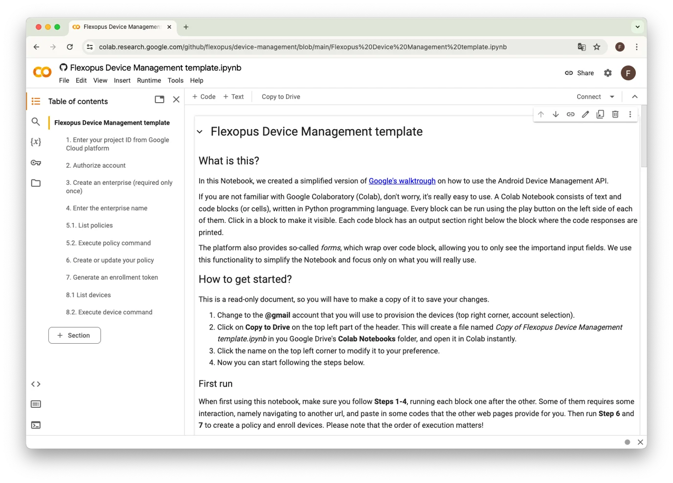 Click on Copy to Drive in the left top corner. This will create a local version of the project in your Google Drive. This will be your project, all changes you make will be changed in your Google Drive. We recommend changing the name of the project in the left top corner from Copy of Flexopus Device Management template.ipynb to your preference. This will be your Google Colab Notebook.