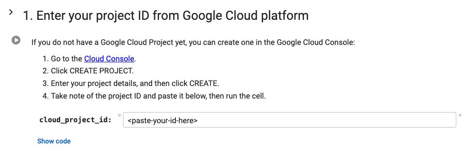 Go back to your notebook and paste the project ID from your Google Cloud Console into the cell below, then run the code. Click Run cell (Play button on the left) to save the variable to the runtime.
