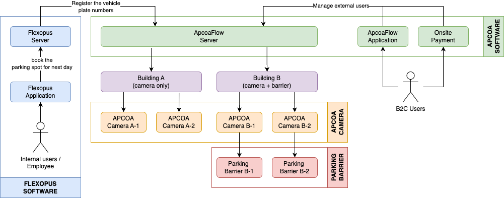 You can allow the access for your parking space for your employees and visitor only and use Flexopus without the hardware integraration Use Case A: Flexopus only, in this case you allow the access only for internal employees, guests, and visitors. Additionally, you can integrate Flexopus with APCOA: c Use Case B: Flexopus/APCOA (Internal) and you can enable the access for externals as well for a some days: Use Case C: Flexopus/APCOA (hybrid). In this section we explain the advantages and disadvantages of the three solutions.