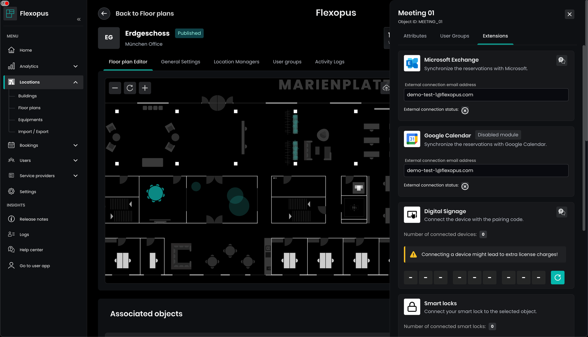 To link a resource, go to the Flexopus location editor. Select the meeting room, and paste Google Resource email address to the external connection email address field.