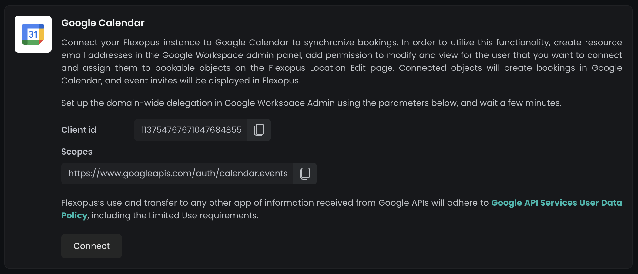 Navigate in Flexopus to Dashboard > Settings > Integrations > Google Calendar as an administrator. If you do not see the setting, contact us at support@flexopus.com.