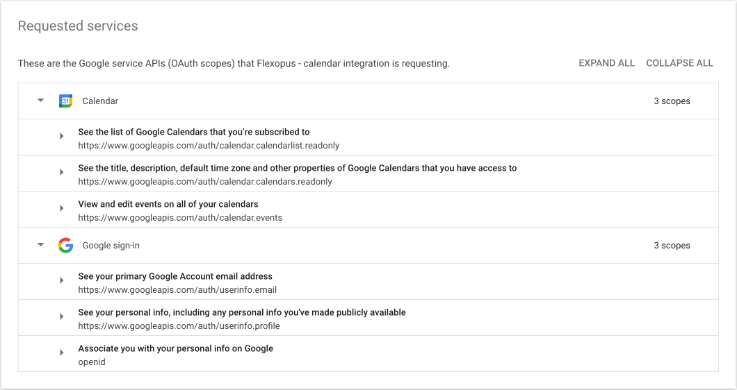 In this section, you will see the list of permissions associated with the Flexopus calendar integration.