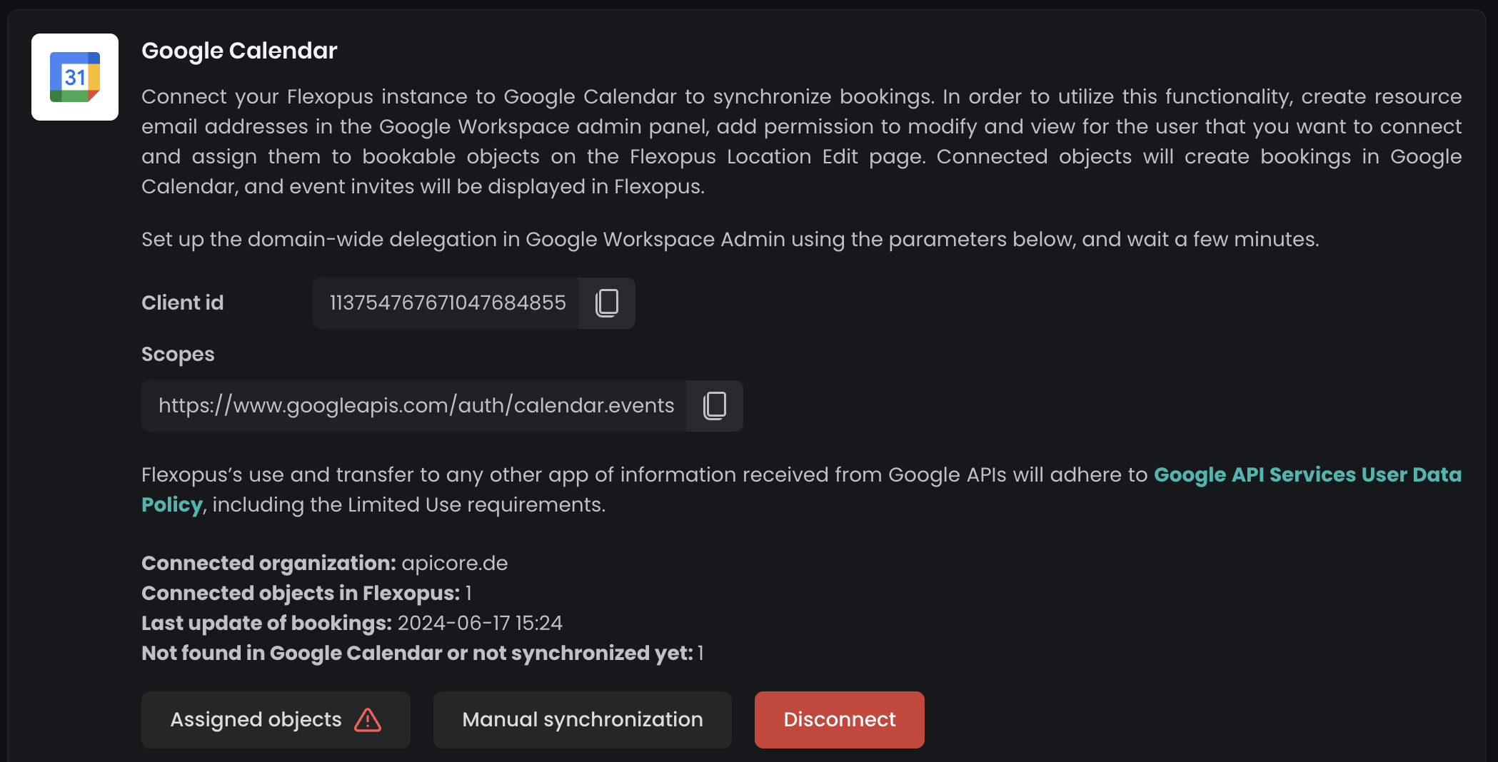Click on the Disconnect button. Flexopus will no longer receive updates from Google. All externally managed bookings will be deleted from Flexopus. You can also go to your Google admin console and block the shared permission with the Flexopus integration.