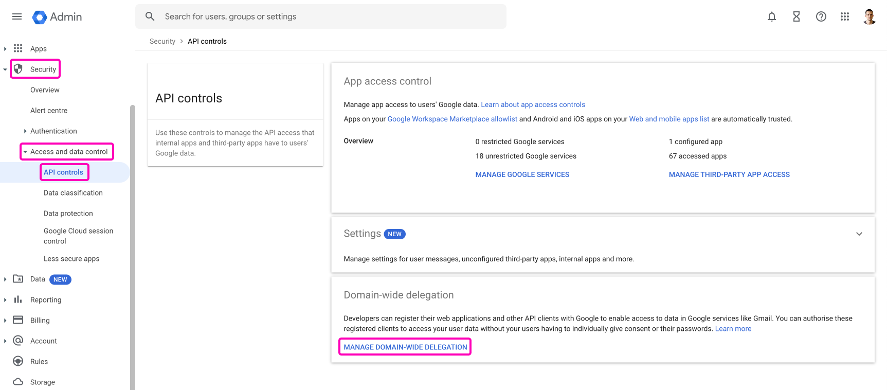 Navigate in your Google admin console to Security > Access and data control > API control > Domain-wide delegation.