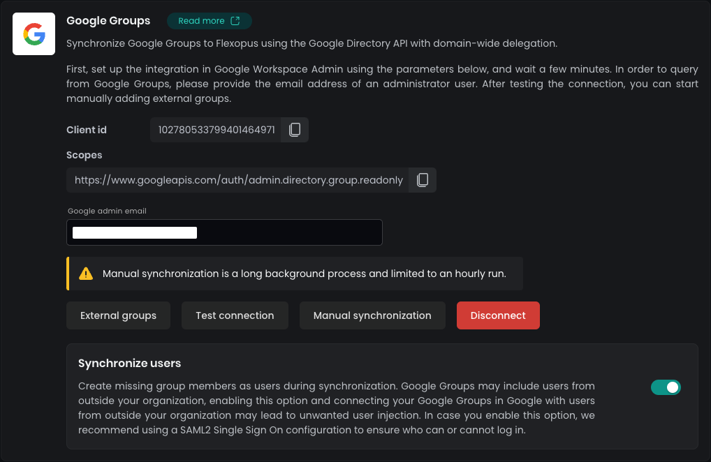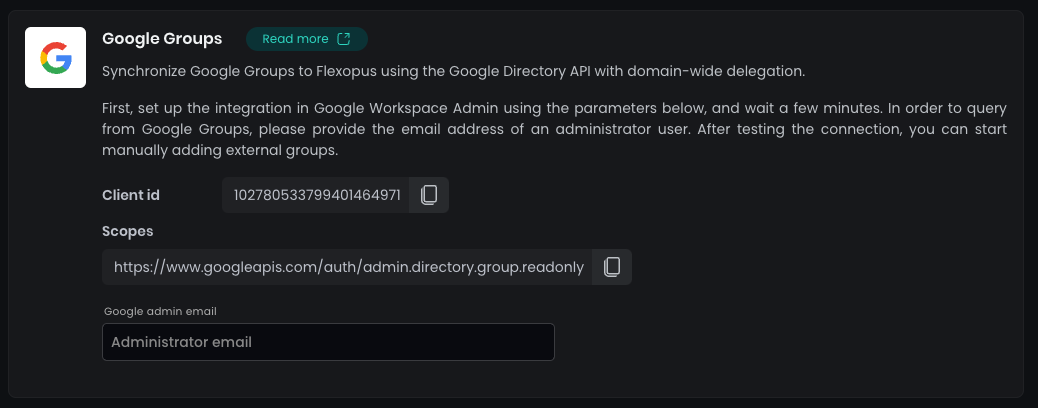 Navigate in Flexopus to Dashboard > Settings > Integrations > Google Groups. Enter your Google admin email address in the Google admin email field and SAVE the settings.