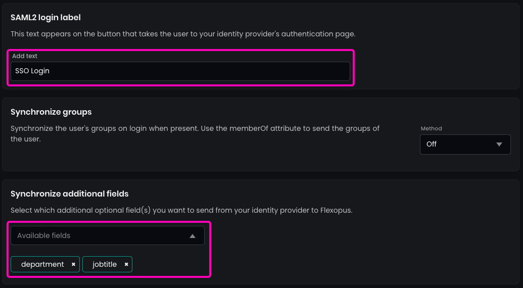 SAML2 Loginbutton to be displayed on the login page. Recommended:SSO Login. - (Optional) Enable the synchronization of the fields configured in the