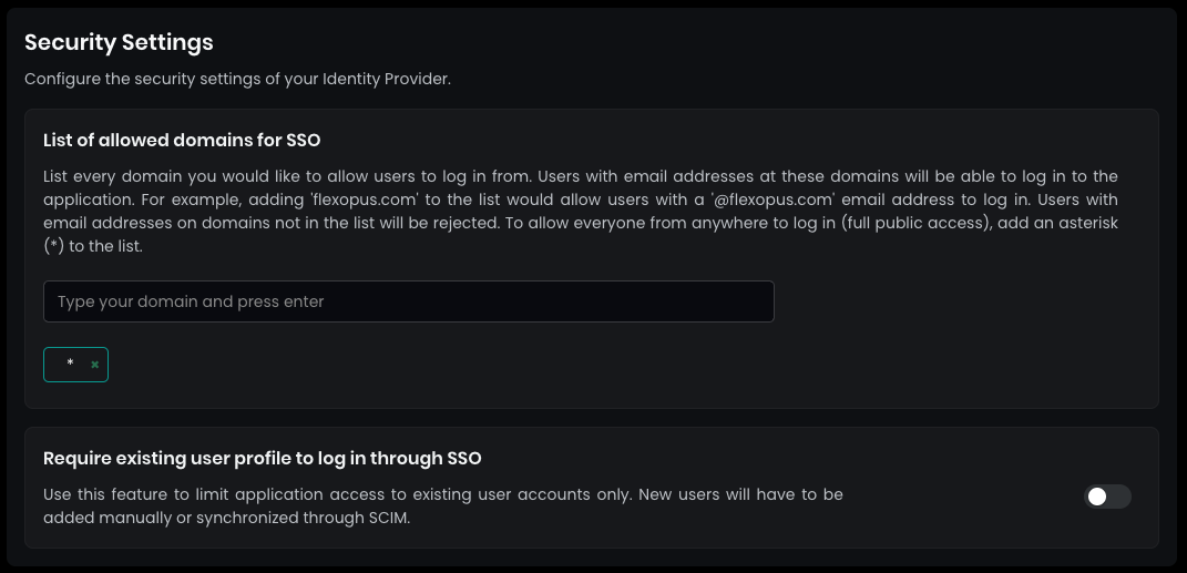 security settings, set theallowed domains for SSOto*(star) and pressENTERto allow all users configured in your Google directory to log in. - By default, SAML2 SSO users are registered automatically after their first login attempt, so you don’t need to create user profiles manually. You can disable this setting if needed, though it’s generally not recommended.