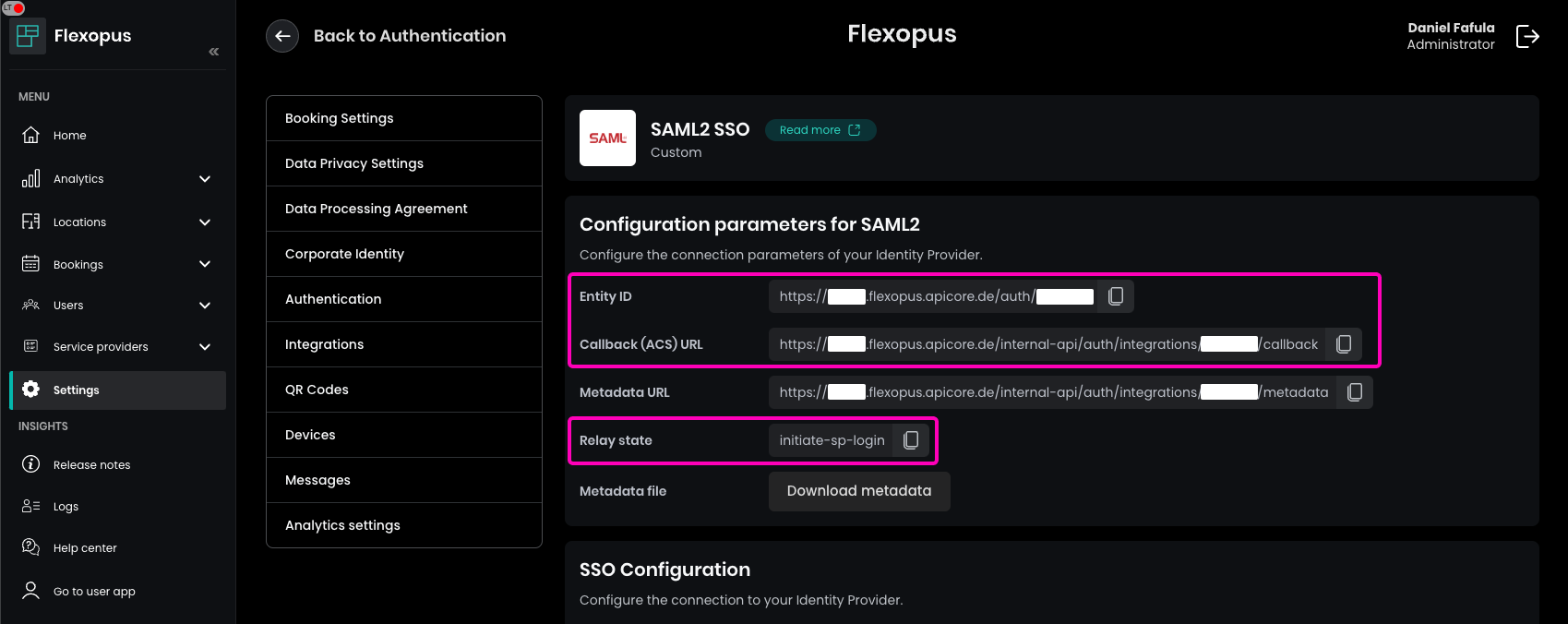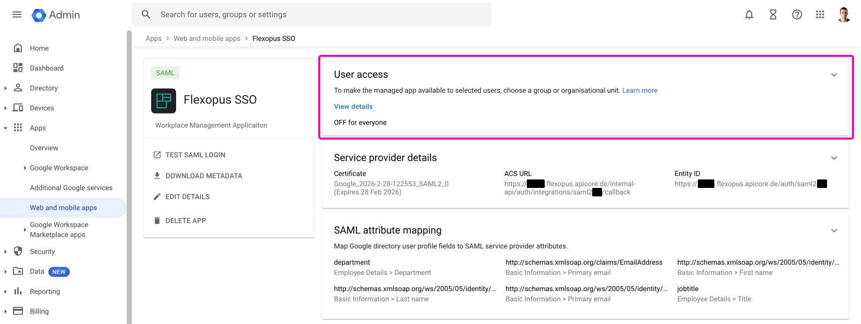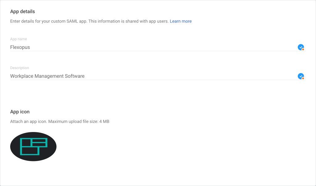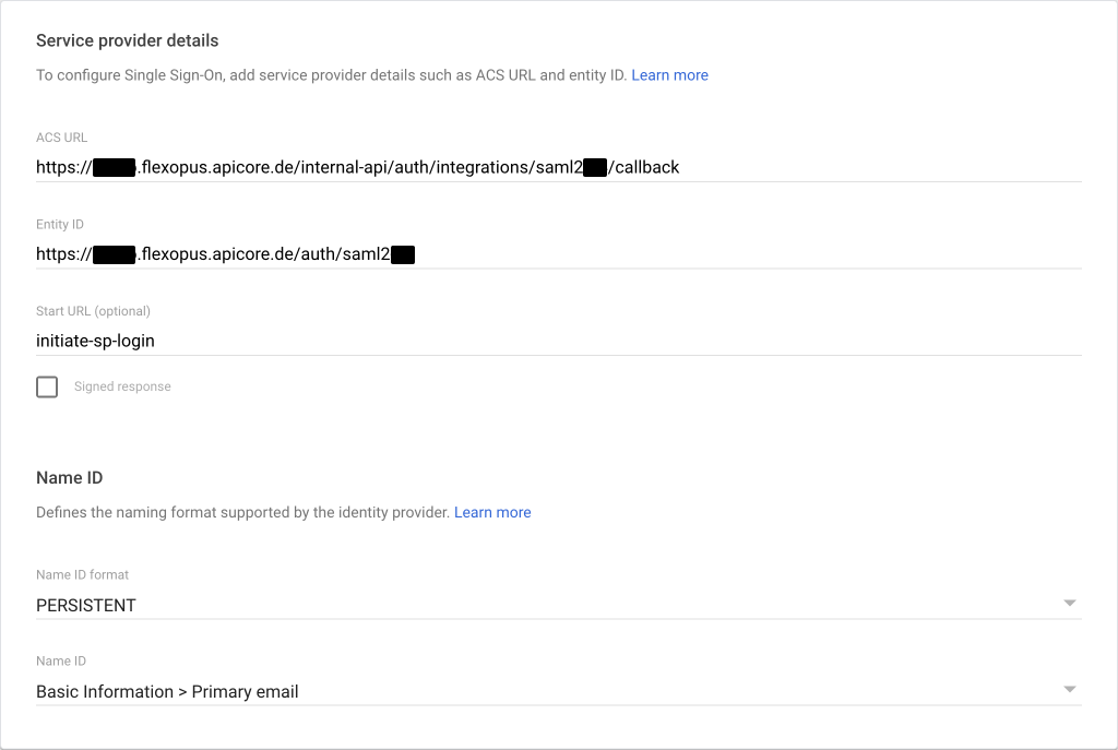 - Copy the URLs from Flexopus to your Google configuration:Entity ID = Entity IDCallback (ACS) URL = ACS URLRelay state = Start URL (optional)