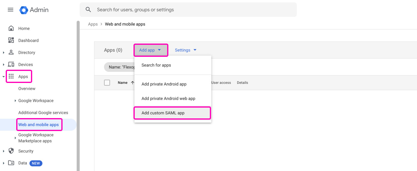 Open the Google Workspace Admin Console and select Apps > Mobile and Web Apps (or use this link). Select the option Add app > add custom SAML app.