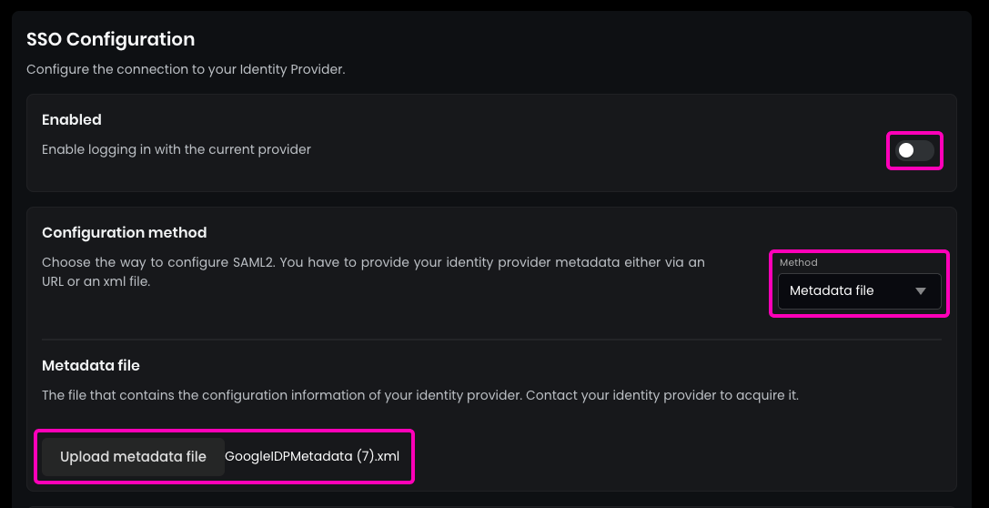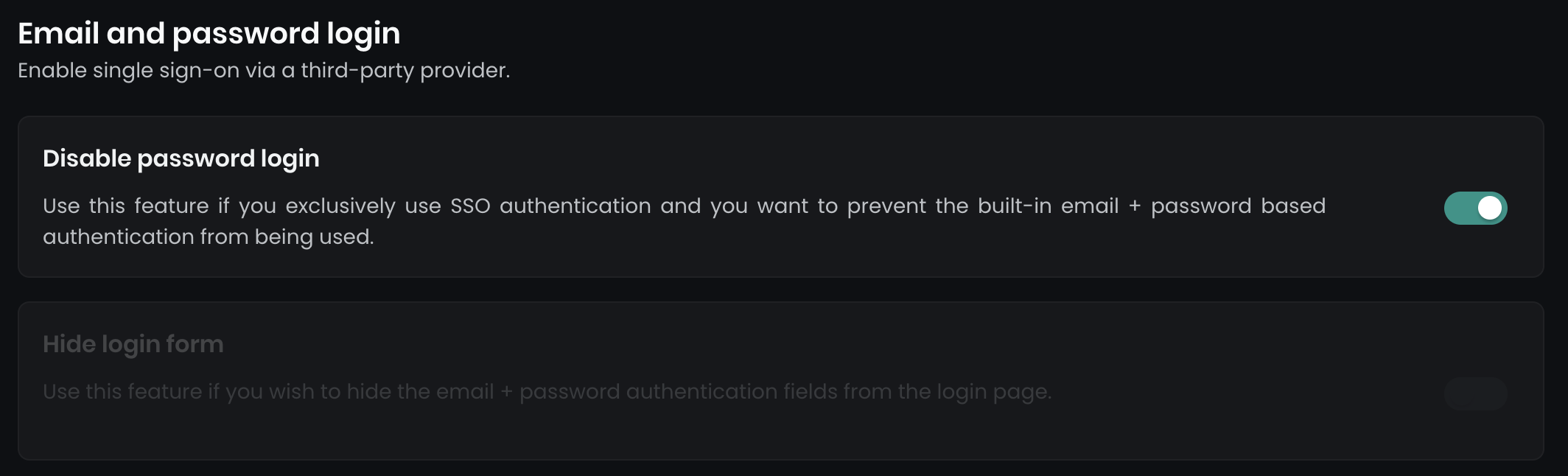 After configuring SAML2 SSO, you can enforce Single Sign-On by disabling email and password login: