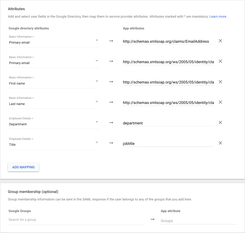 | Google directory attributes | App attributes | Note |