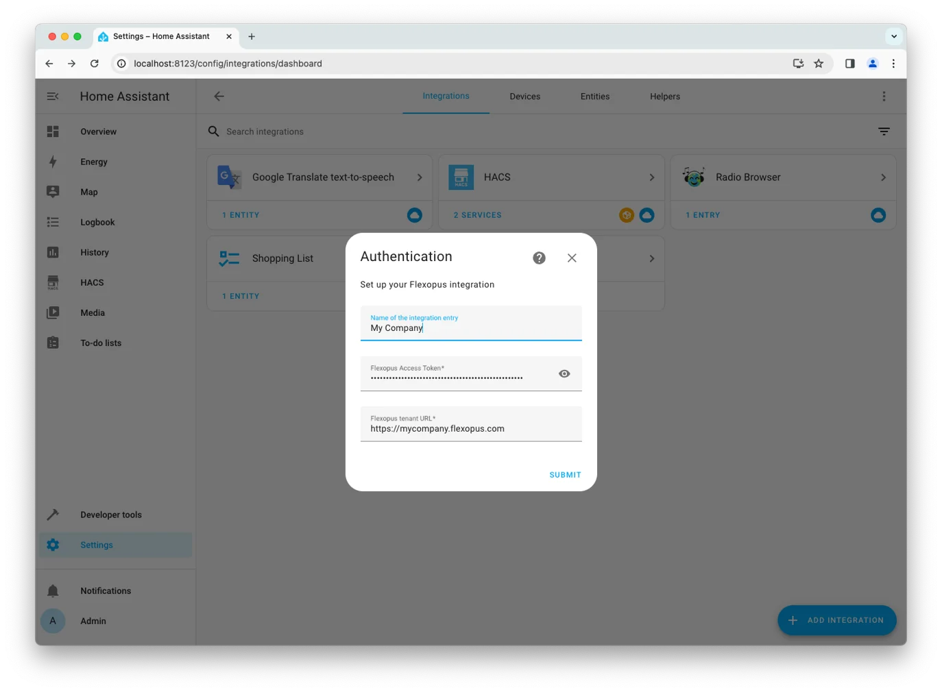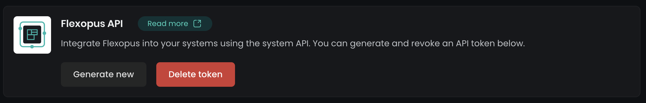 In Flexopus, go to Dashboard > Settings > Integrations > Flexopus API as an administrator. Click Generate Token, then copy the token and paste it into your Home Assistant integration.