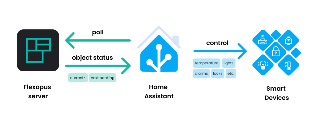 We have created the Flexopus integration to provide basic occupancy information about the status of bookable resources in your locations. Using this connector interface, your Home Assistant instance can connect to the Flexopus servers and poll them for information at a predefined interval. Our servers then reply with the current and expected occupancy status of the bookable resources.