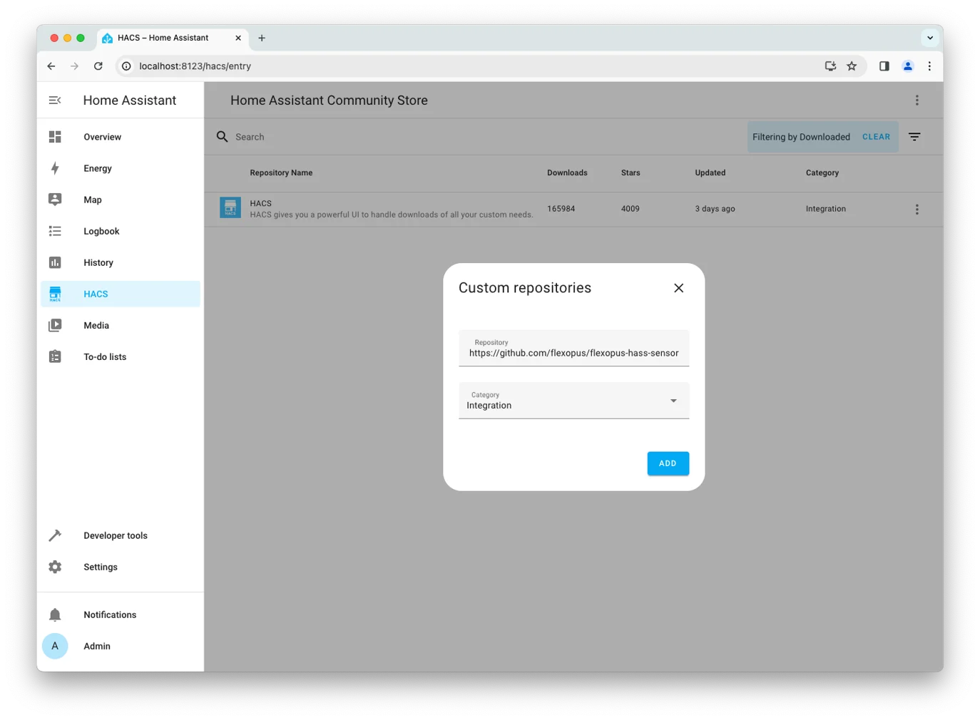 Click the three dots and select Custom repositories, and add the Flexopus GitHub repository (https://github.com/flexopus/flexopus-hass-sensor) as Integration
