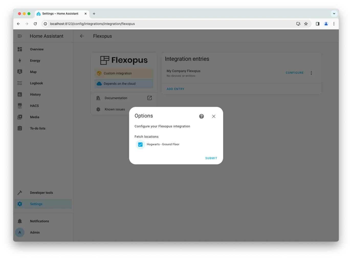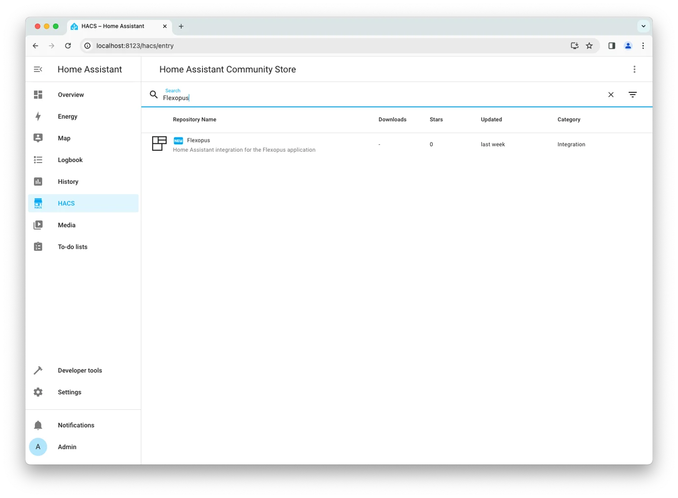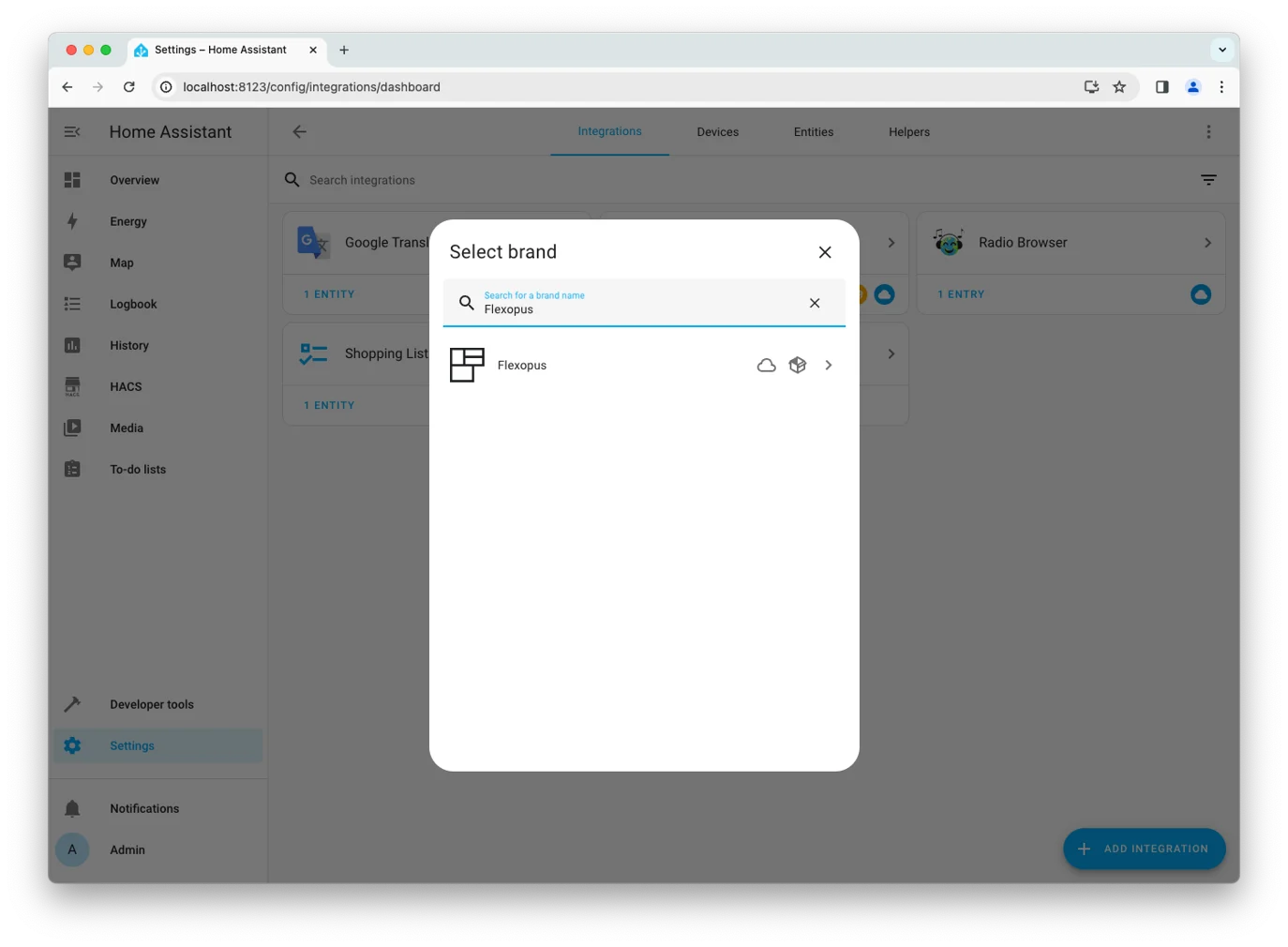 In Home Assistant, go to Settings > Integrations, click Add Integration, and search for “Flexopus”.