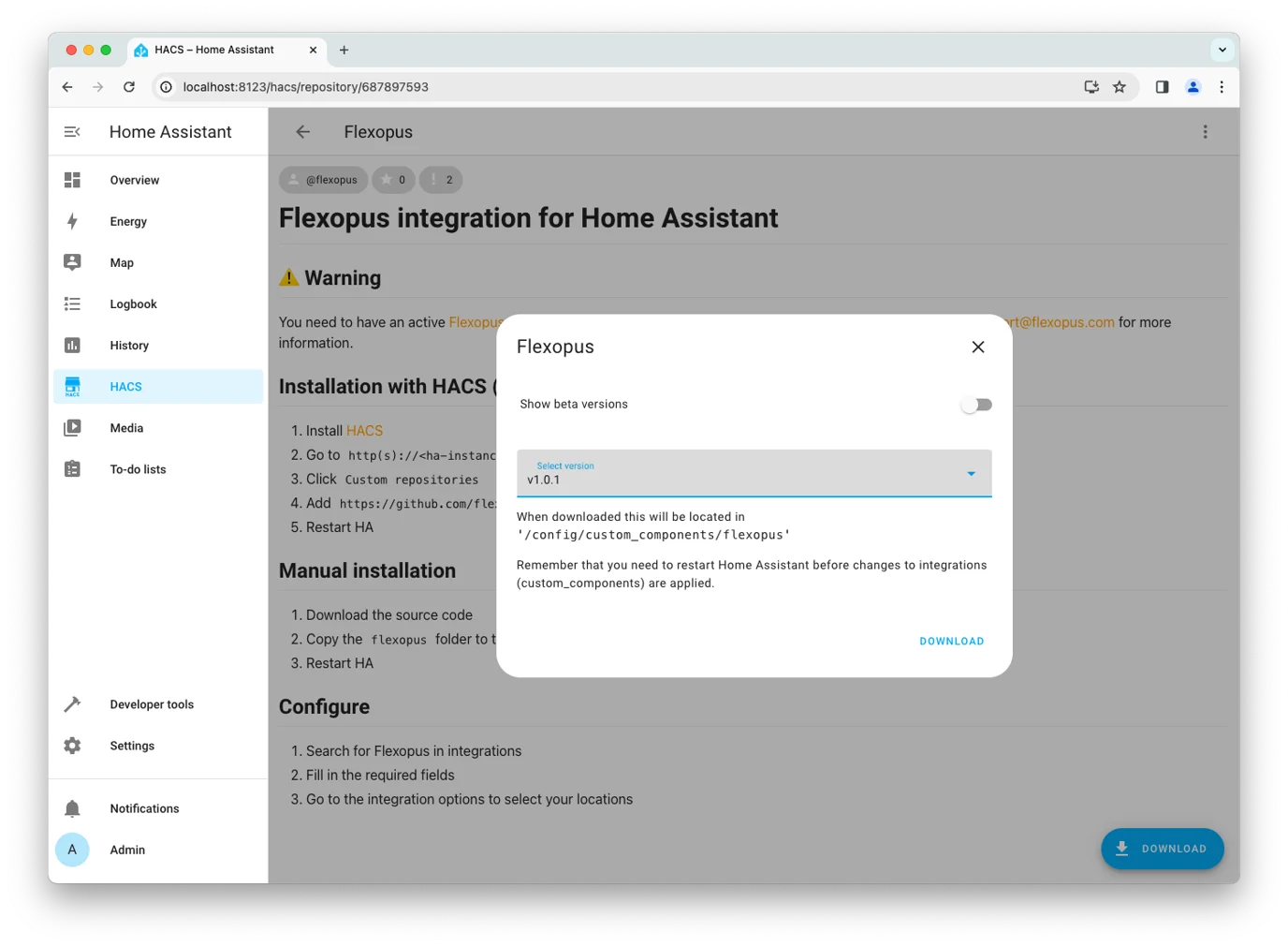 custom_components/flexopusfolder to thecustom_componentsfolder of your installation. The resulting structure should be: