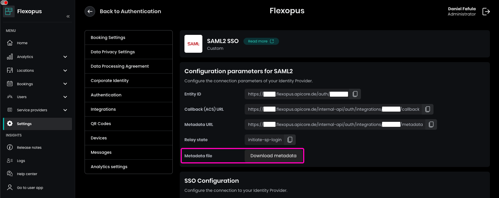 In Flexopus, navigate to Dashboard > Settings > Authentication and select the created SAML2 Provider. Enable the SAML2 SSO and paste the metadata URL into the configuration field.