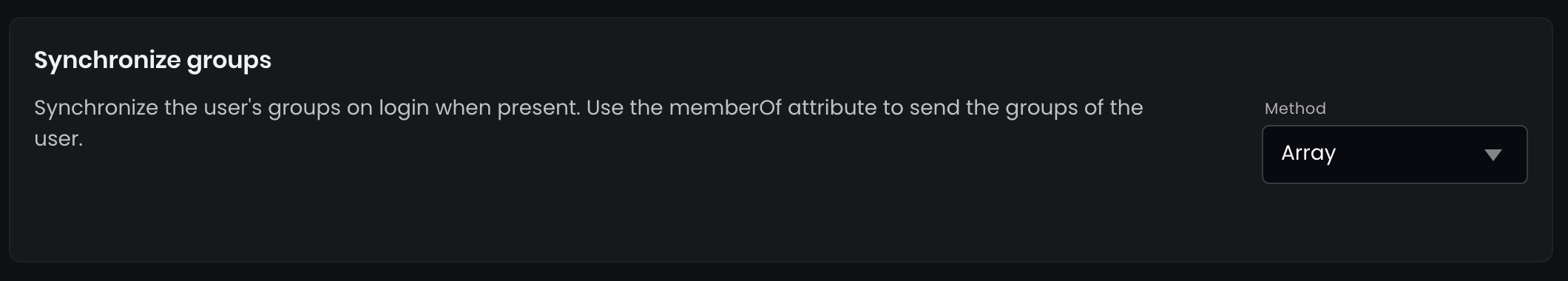 Navigate in Flexopus as an administrator to Dashboard > Settings > Authentication. Click on the preconfigured SAML2 provider and find the setting labeled Synchronize groups. By default, this setting is off. Change it to array.