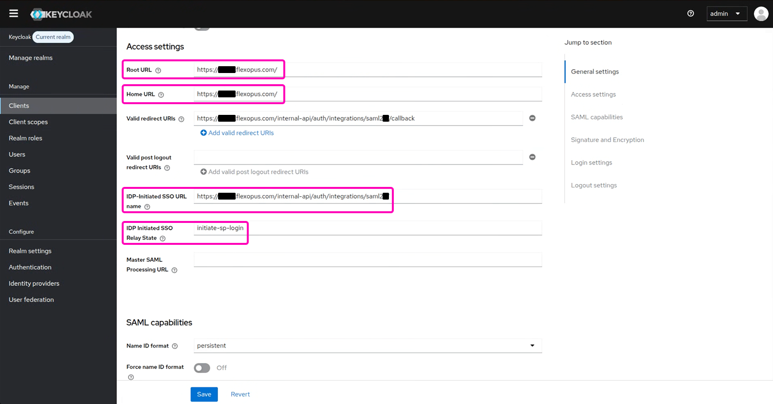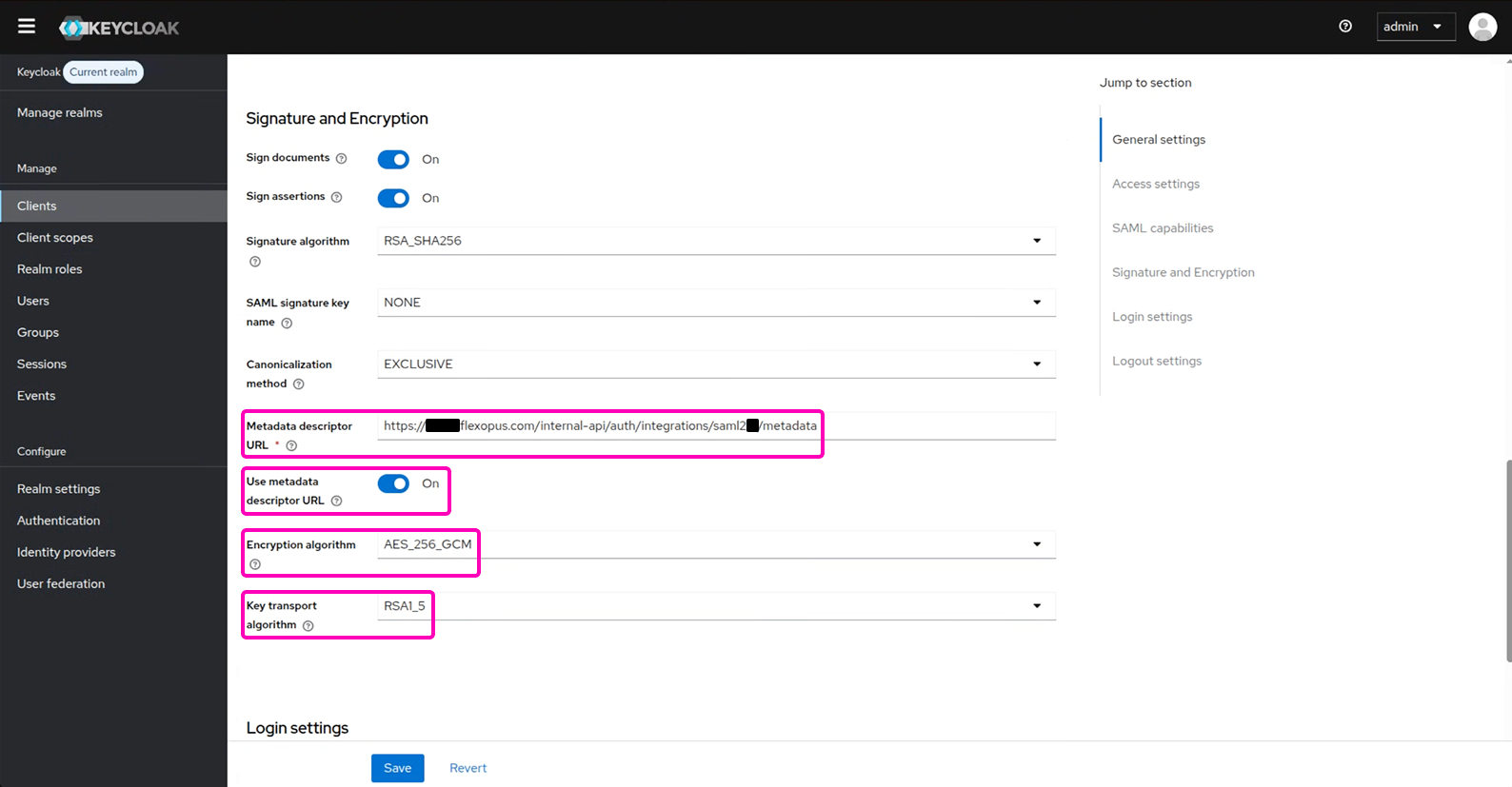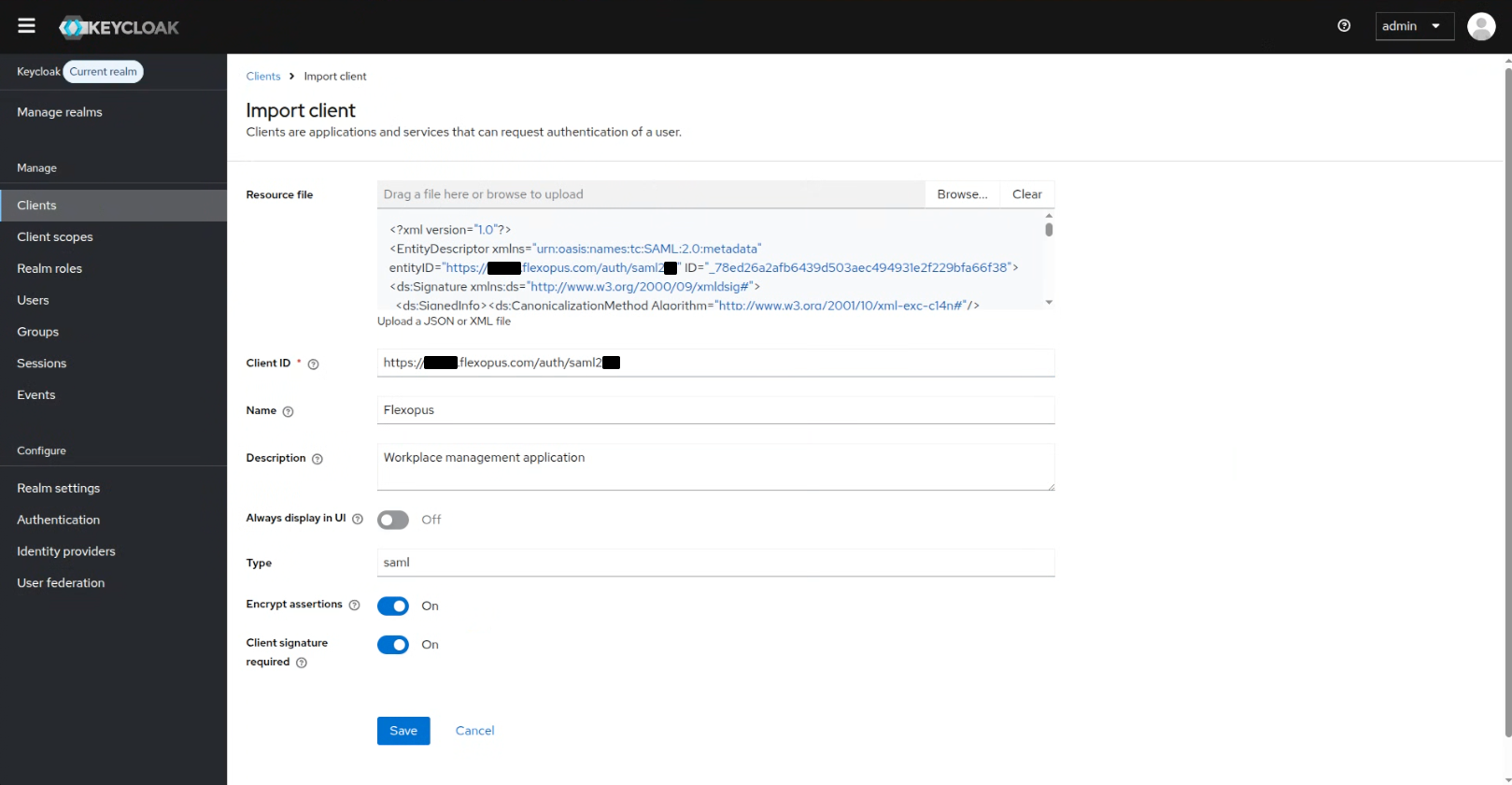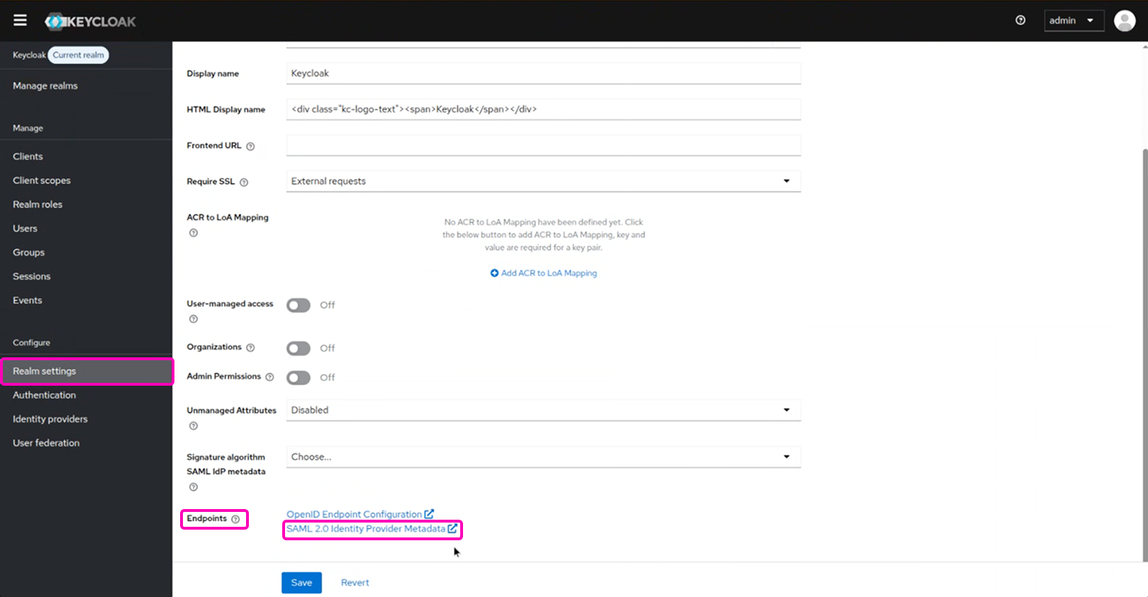 In your Flexopus instance, you can now store the following URL at METADATA URL. Configure > Realm settings > Endpoints. Copy the SAML 2.0 identity Provider Metadata URL.