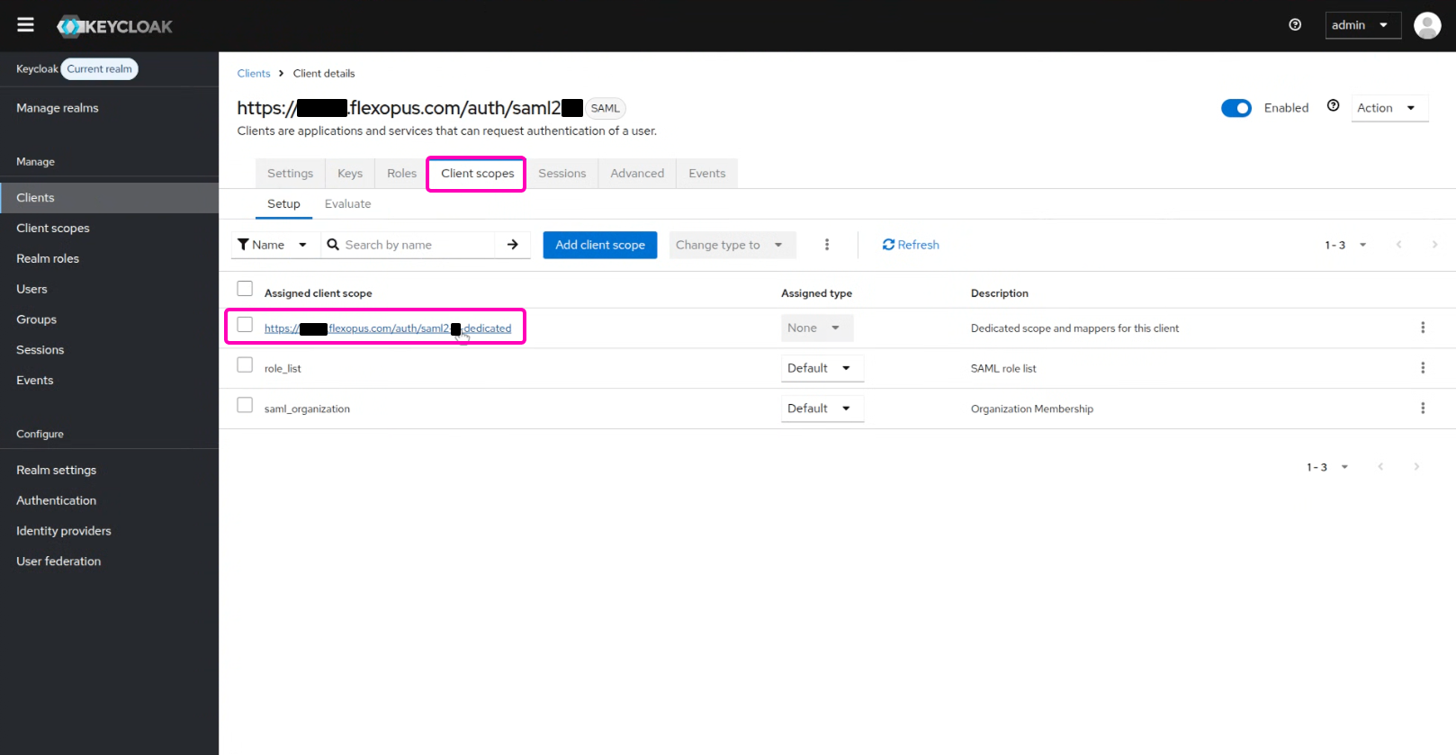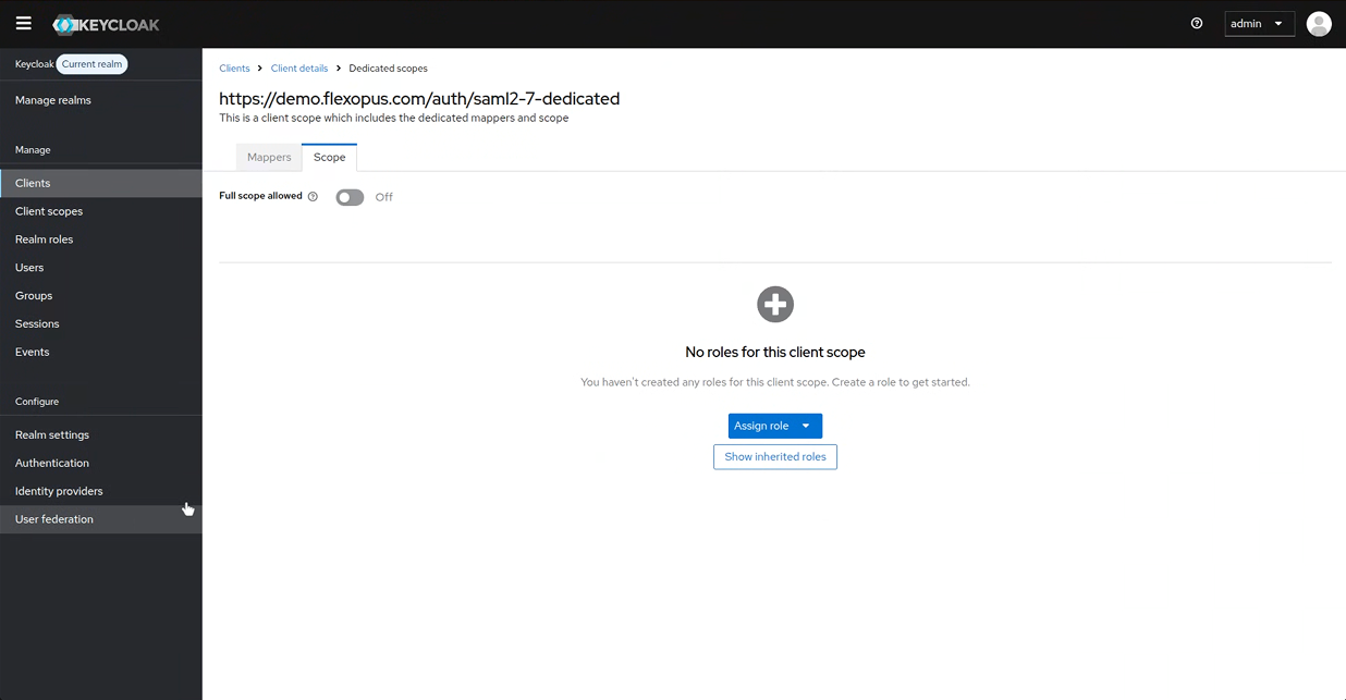 Connect Flexopus with Keycloak via a SAML2 for Single Sign-On (SSO). With the integration, you can manage through your KeyCloak Directory which users should have access to Flexopus and force them to use their KeyCloak credentials for the login. Based on a SAML2 settings in Flexopus you can let the user profiles be created after the first successful SAML2 SSO login attempt to avoid a manual user creation process at Flexopus.
