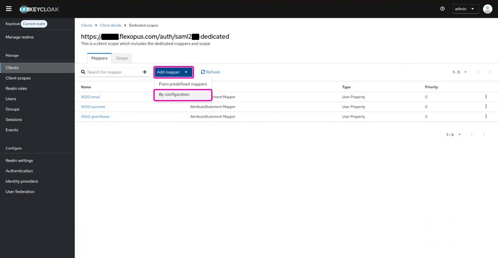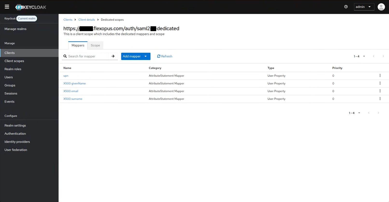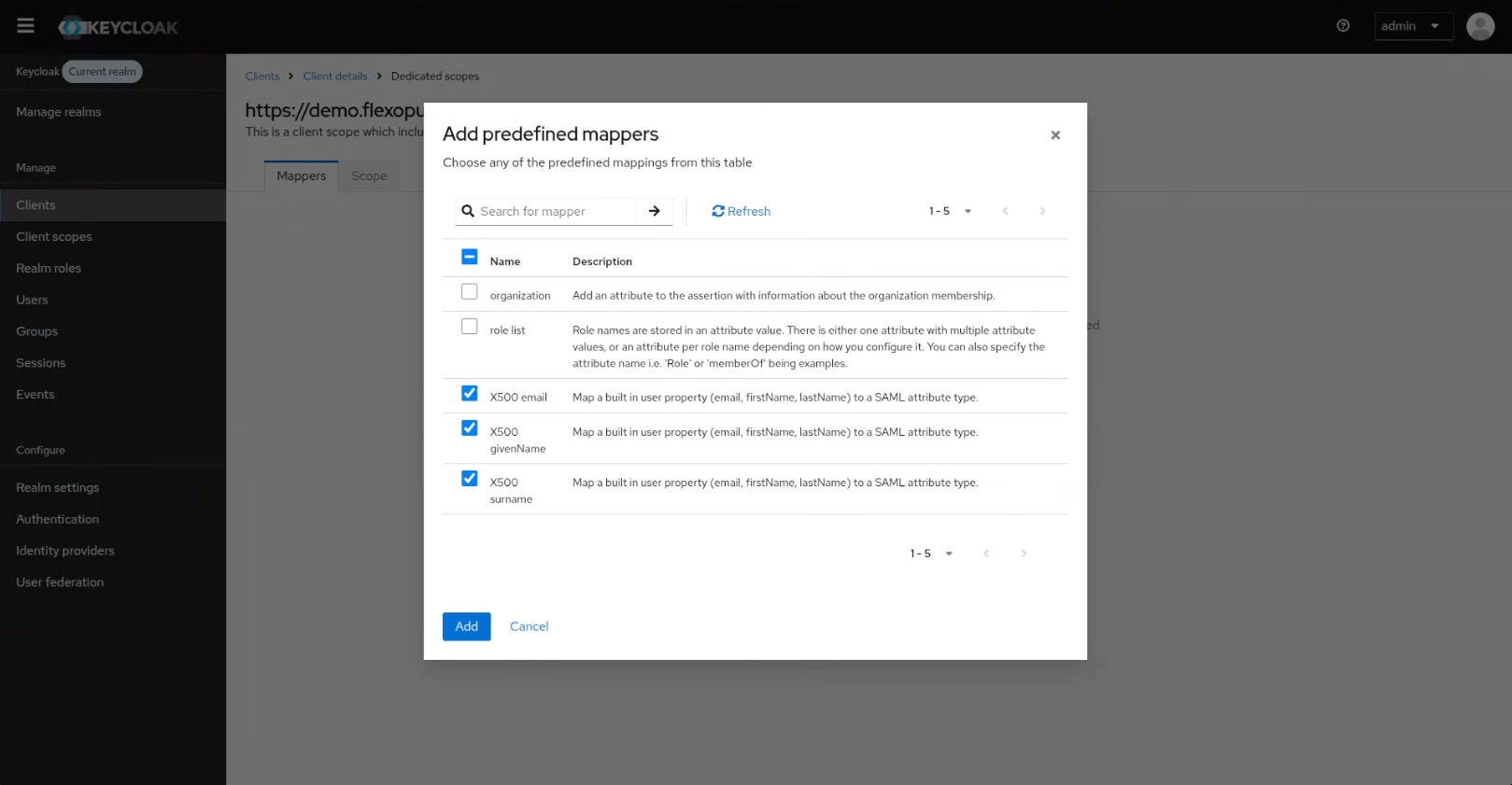 Click on the Mappers > Add predefined scope. Select X500 email, X500 givenName, X500 surname. Click Add.