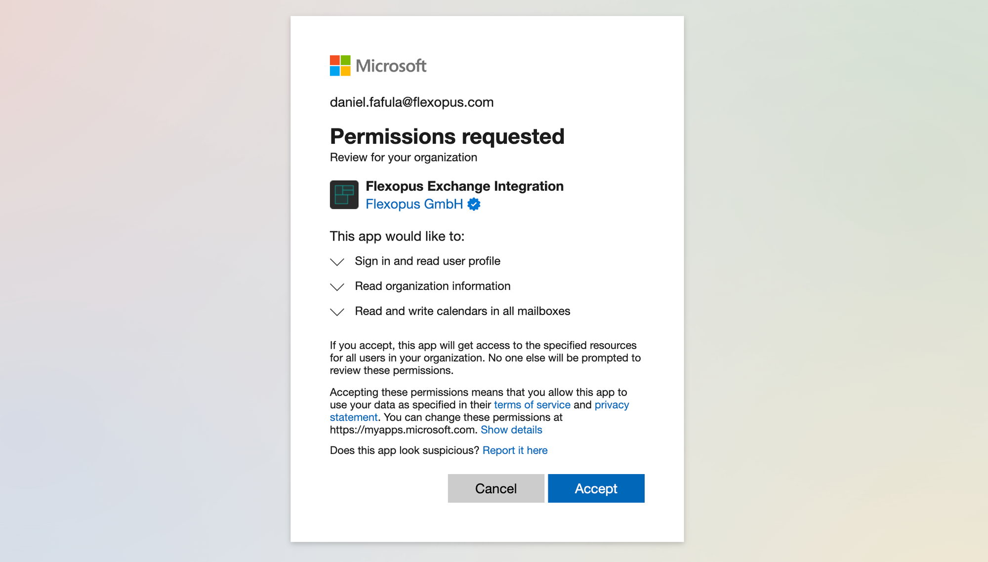 By granting Flexopus the Calendars.ReadWrite delegated application permission rights, Flexopus can access all personal and resource mailboxes of your organization.