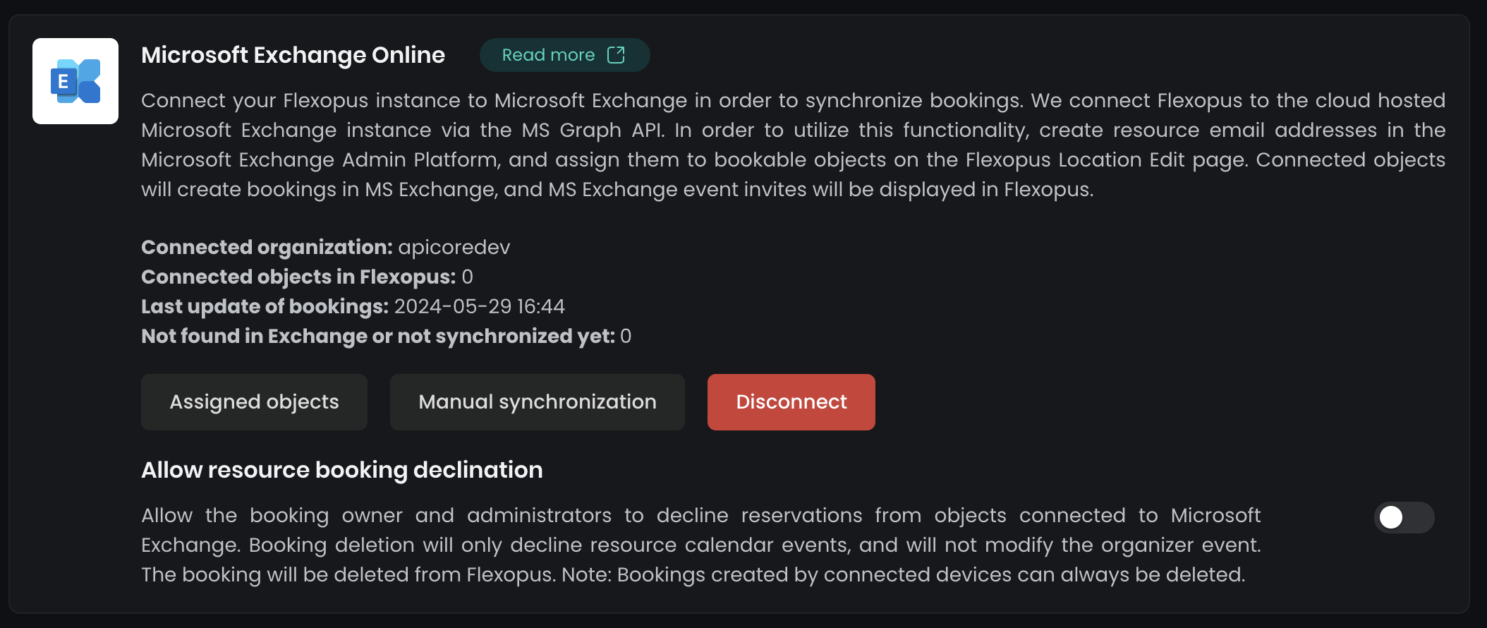 Disconnectbutton. This will stop Flexopus from receiving updates from Microsoft. - All externally managed bookings will be deleted from Flexopus.