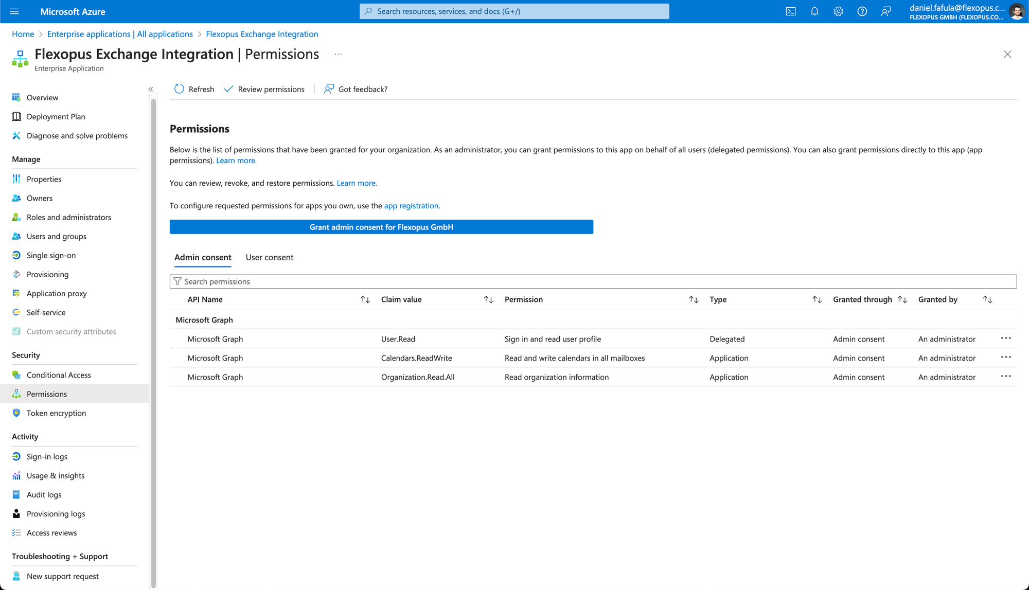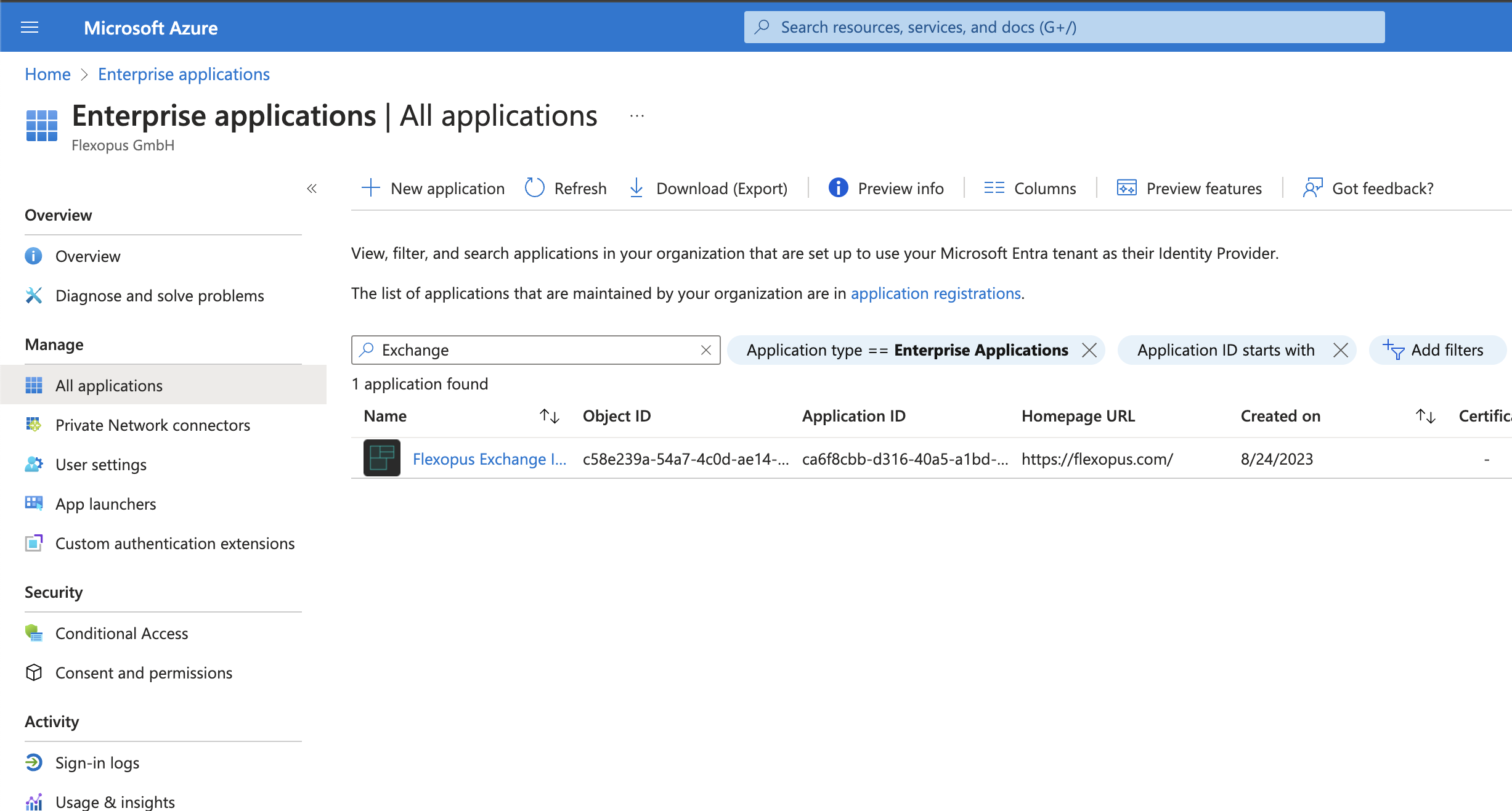 Furthermore, Microsoft will automatically create a new enterprise application in your Active Directory with the Flexopus Exchange Integration name here.