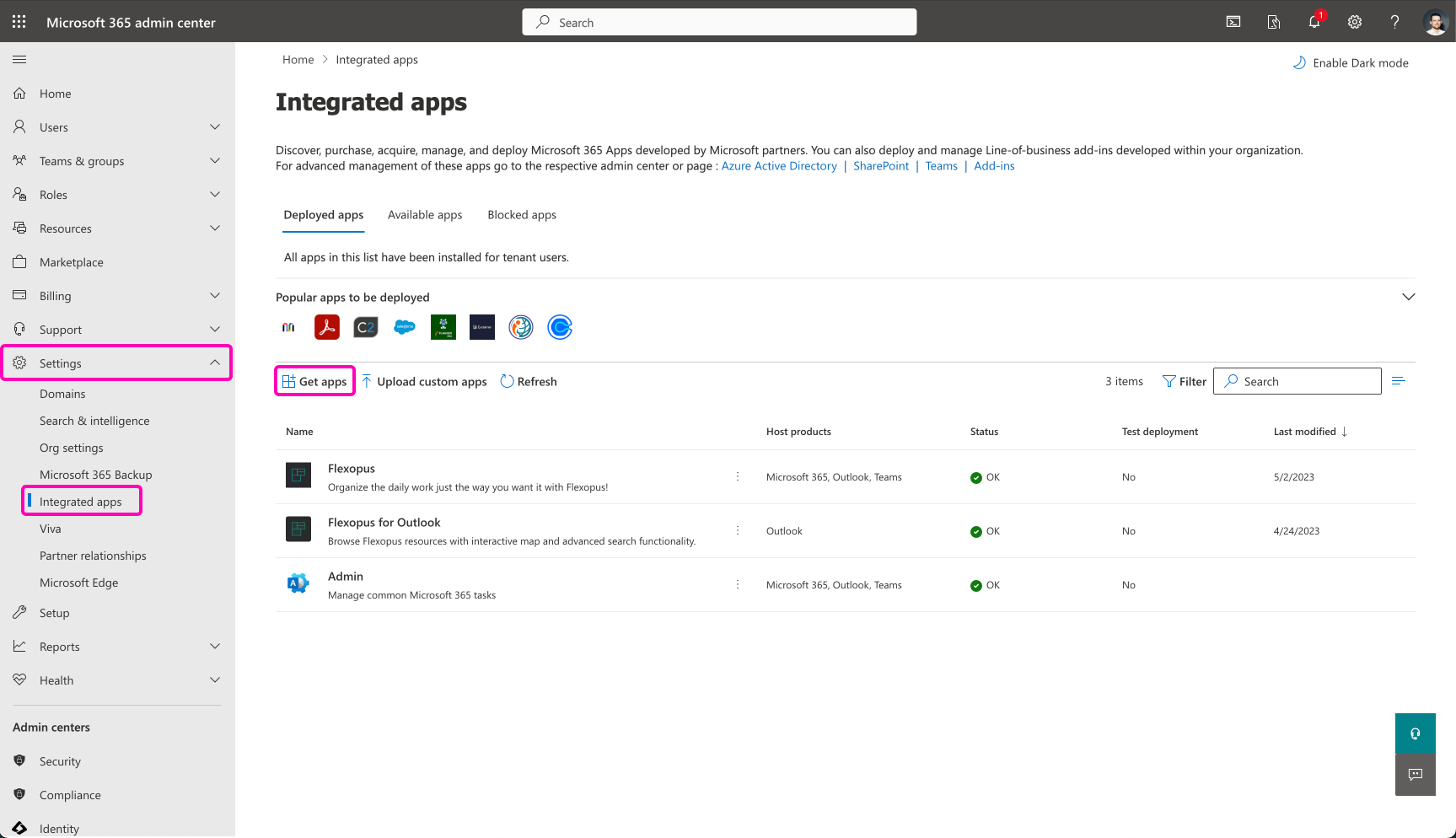 The Microsoft Outlook add-in can also be installed easily organization-wide. Navigate to the Microsoft 365 admin center to Settings > Integrated Apps. Go to Microsoft Integrations. Click on the button Get Apps.