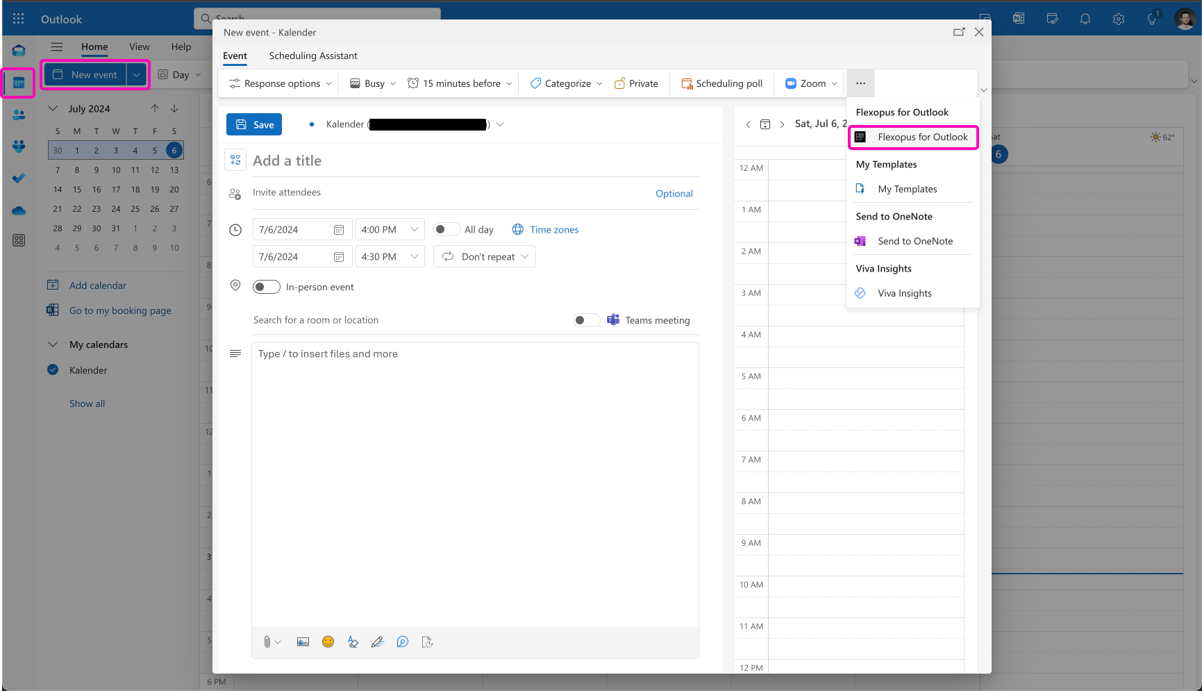 Open your Calendar, create a New Event, and search in the navigation bar for the application called Flexopus for Outlook.