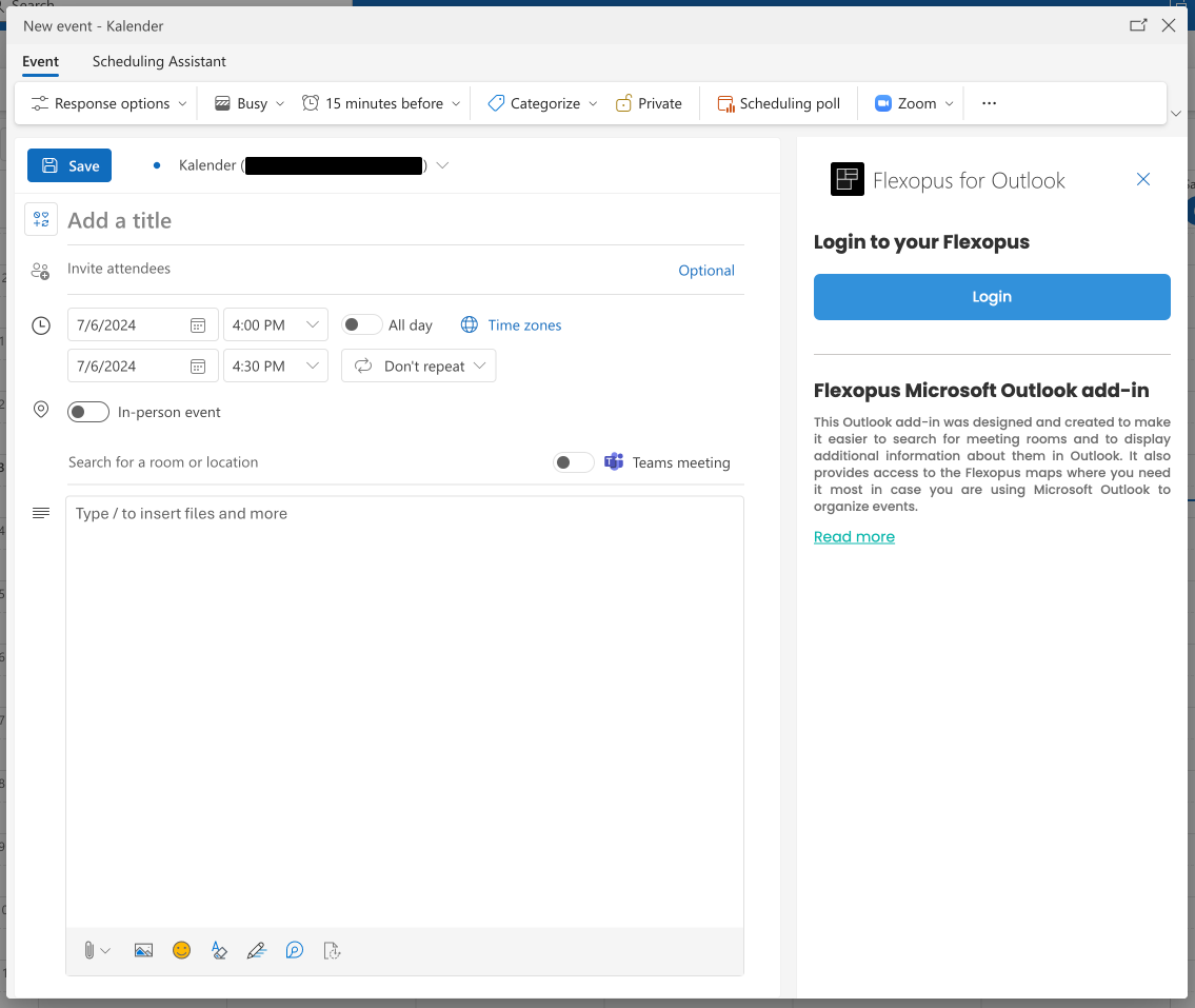 In the booking process of meetings, the Flexopus add-in is opened in an iframe on the right side. Authentication in the application runs independent of Microsoft Outlook. You have to log in in the add-in with your Flexopus login.