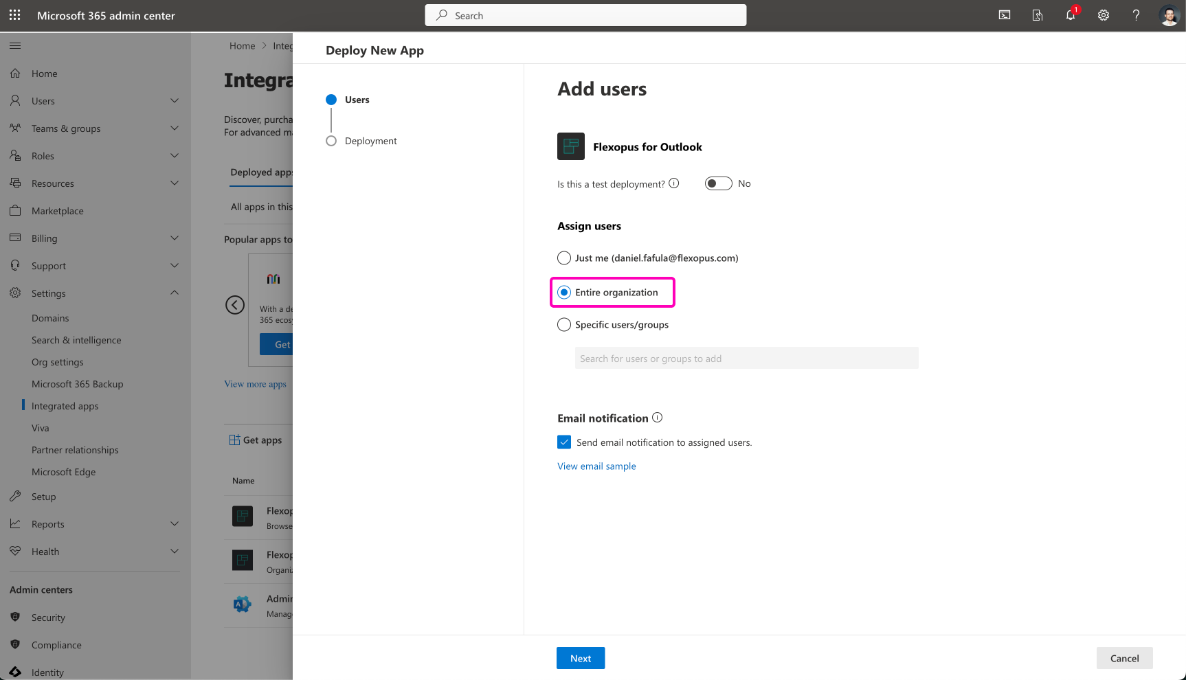 In the new window, you can decide who shall be able to install the Outlook Add In in your organization. We recommend selecting the entire organization.