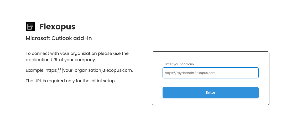 Open the add-in and click on login. This will redirect you to a domain selector. Client instances have separate databases and separate login URLs, so you need to link the plugin to your instance by URL, which is the URL of your Flexopus application. Example: https://{your-company}.flexopus.com