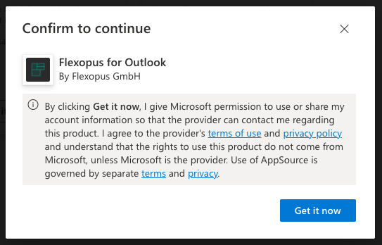 Accept the terms of use and privacy policies of both Flexopus and Microsoft. By installing the plugin, you are not entering into any additional obligations with Flexopus. There are no extra costs associated with the installation. The plugin only collects the necessary personal data required to provide its functionality and does not store the content of your appointments.