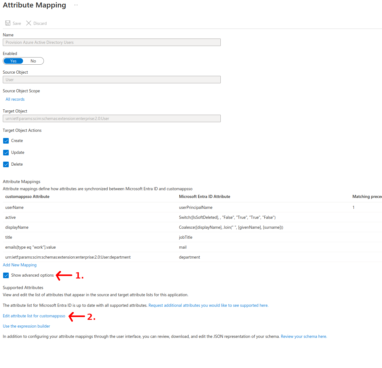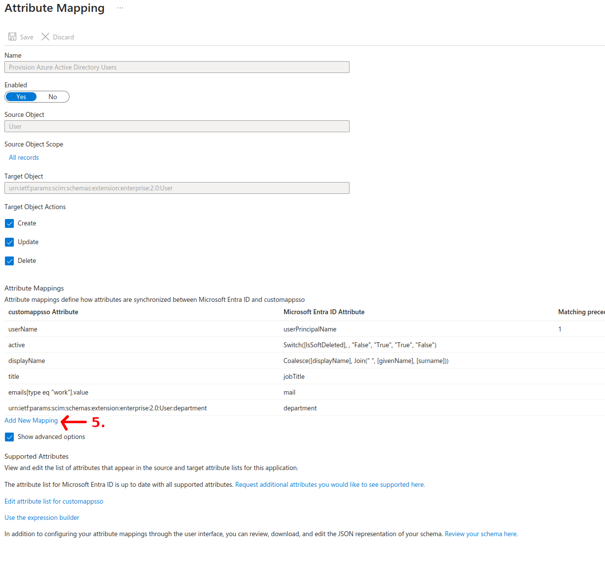On the SCIM server side, you have to add additional attribute mappings to the SCIM connection. The following four screenshots with six steps guide you through creating a mapping like this in Microsoft Entra (formerly Azure). The example uses extensionAttribute2 for demonstration purposes, but you can use any of the ten supported attributes. The example shows the steps for Microsoft Entra, but creating a mapping should be similar in most SCIM server implementations.